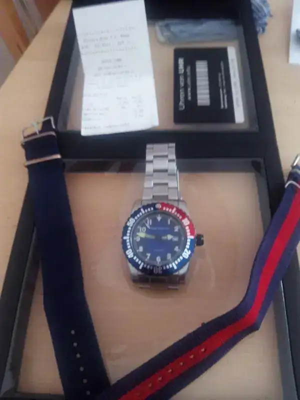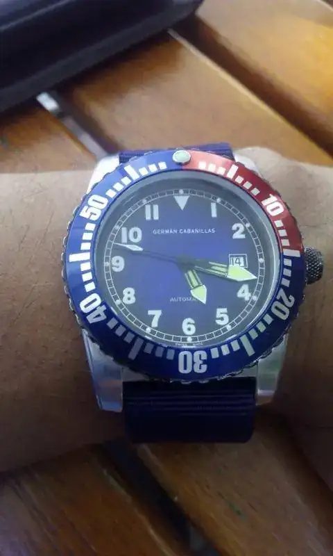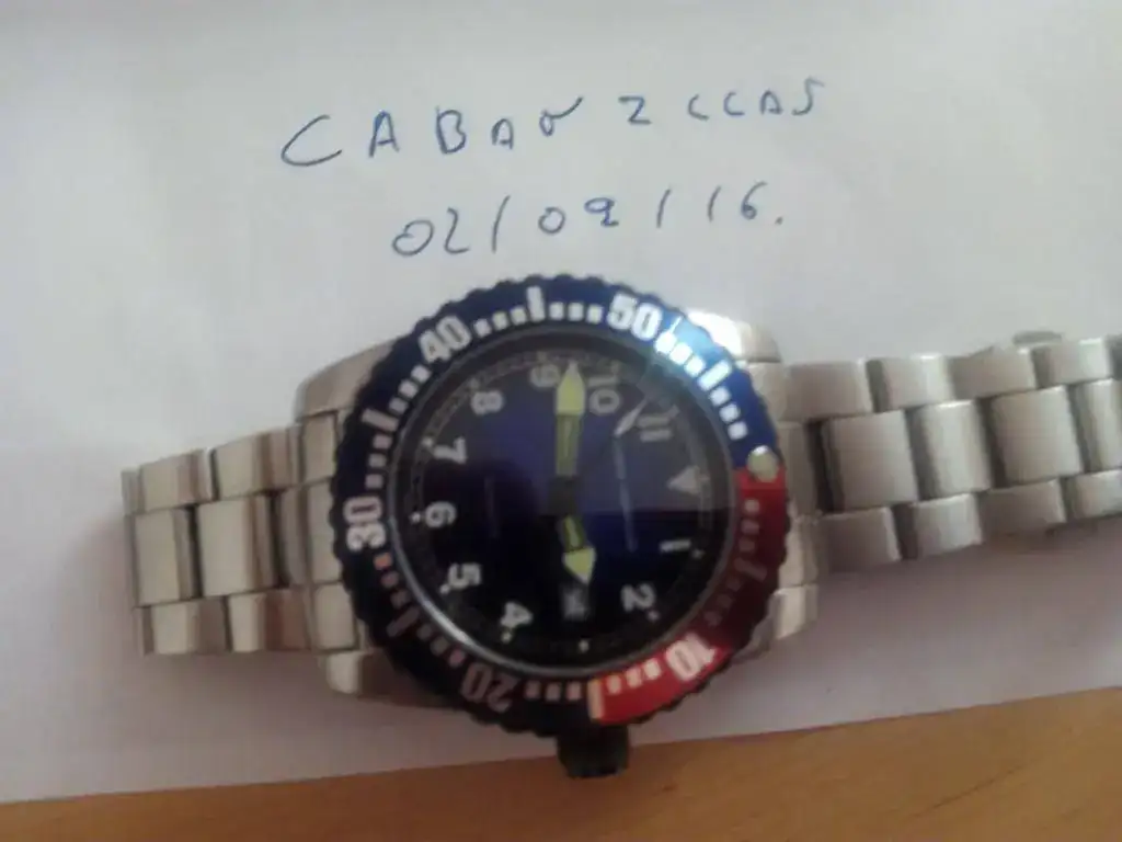 [TD]46 mm.Caja de acero inoxidable,con corona y tapa trasera roscadas.En la tapa trasera luce la marca original,Urh.Corona giratoria unidereccional a 60 clicks,bisel pepsi original de la marca Zeno.