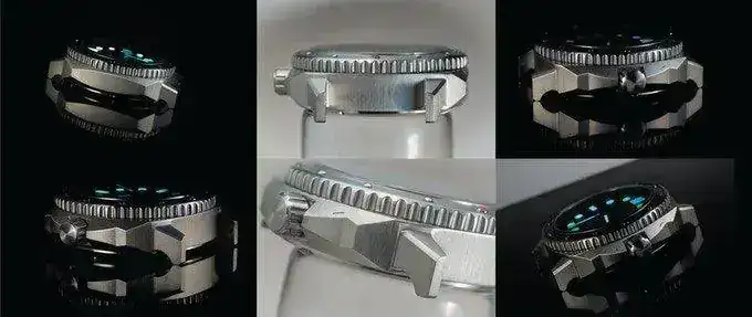Es un diver de 42mm, con un diseño bastante atractivo y disponible en tres colores (blanco y negro, rojo y negro o azul). Nota que la caja va rasgada con marcas a propósito, como si el reloj hubiera pasado por una batalla. El diseño de la caja es muy singular.