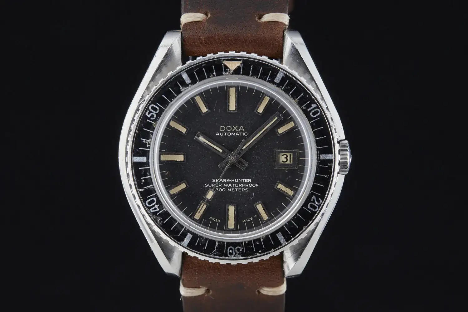 Casi siete años tardará , entre 1956 y 1963, en ver la luz su primer modelo, el Doxa 11804 "Shark-Hunter" 300m. Este es un modelo grande para el momento, caja de 43mm que comparte diseño con el Omega Seamaster 300 y Eberhard Scafograf 300, pues Huguenin Freres es el fabricante de todas ellas.
