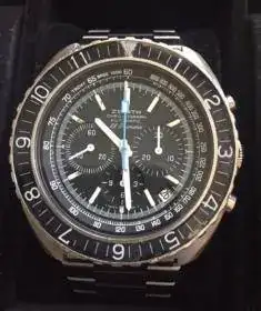 En primer lugar un Zenith El Primero Pilot/Diver , ref. 01-0180-415, con su espectacular calibre 3019 PHC a 36.000 alt. Este "monstruo" se va a los 44mm, y más bien parece que correspondería al segmento de los modernos cronos deportivos, pero el detalle es que este reloj es de "1971". Todas y cada una de sus piezas son simplemente espectaculares para la época : el primer calibre crono-automático, que además funcionaba a 36.000alt; la espectacular caja MZ, su armis Gay Freres, su cristal de zafiro, etc...