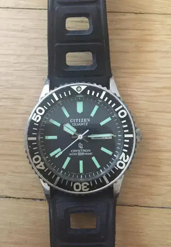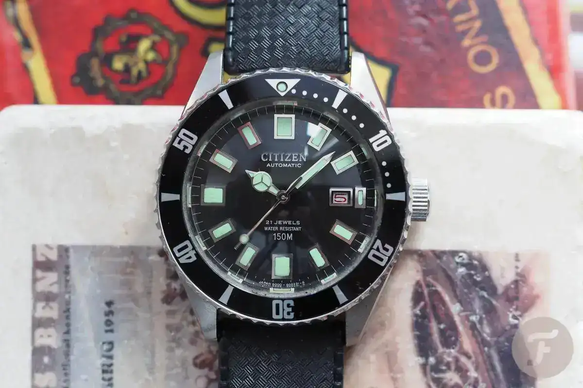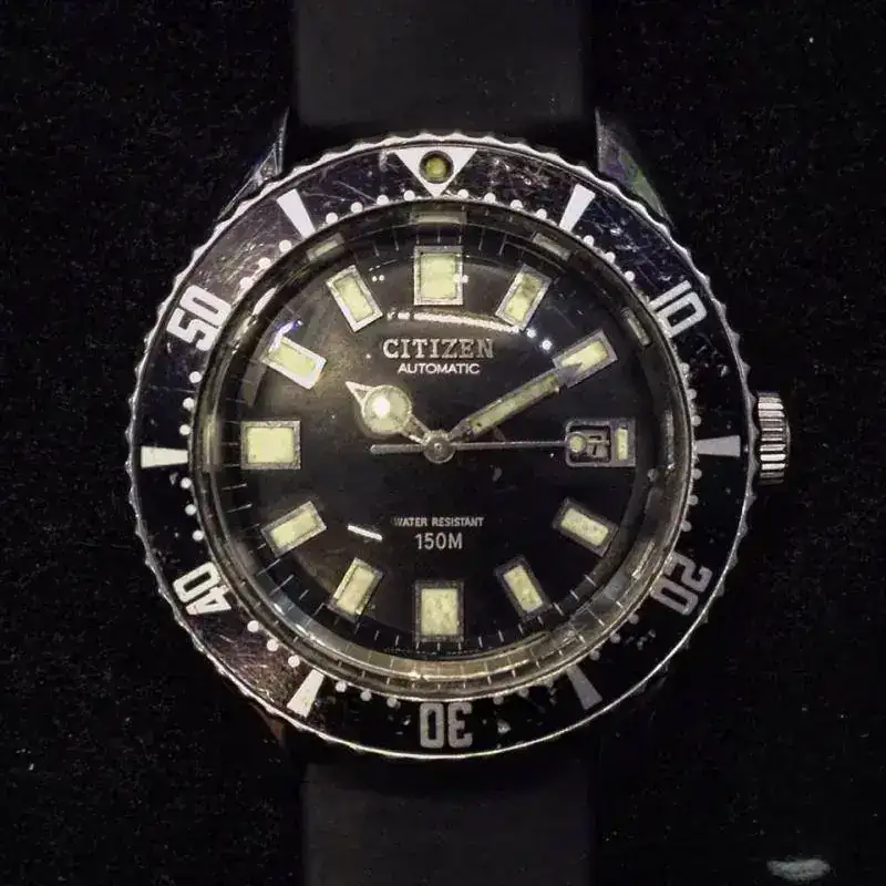 En 1977 se lanza el Citizen 150m Ref. 52-0110 “Flying Diver”. Esta denominación se debe a que fue reloj de dotación, pero curiosamente no para buzos o marinos, sino para pilotos de cazas de combate, concretamente para los pilotos de F-16 de la PAF (Fuerza Aérea de Pakistan). Quizás en previsión de amerizajes forzosos digo yo…. este reloj es el Citizen diver más conocido de la época, rival directo del “Turtle” 6309 que Seiko fabricó entre 1977 y 1988 (derivado a su vez del mítico 6105). Caja de 40mm con cal. Miyota 8210A y cristal hardlex. Con dial negro la mayoría de las veces, aunque se vieron también naranjas y azules.