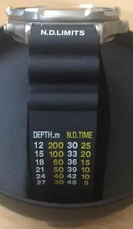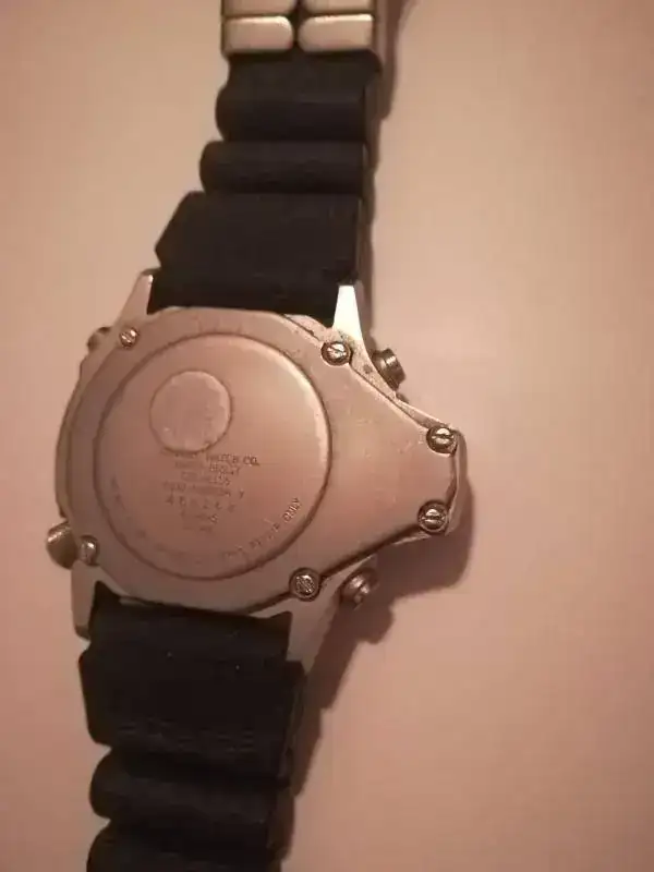 Nuestro reloj presenta una caja asimétrica de titanio de 45mm, con tapa posterior con 4 tornillos y 3 baterias. Su calibre era Ana/Digi, es decir analógico y digital, con cronógrafo, profundímetro, indicador de bateria y una novedosa correa de caucho extensible con los tiempos límite de buceo a diferentes profundidades sin necesidad de realizar descompresión (N.D.LIMITS).