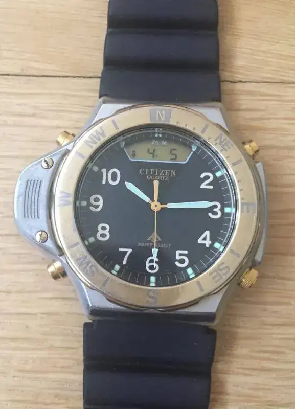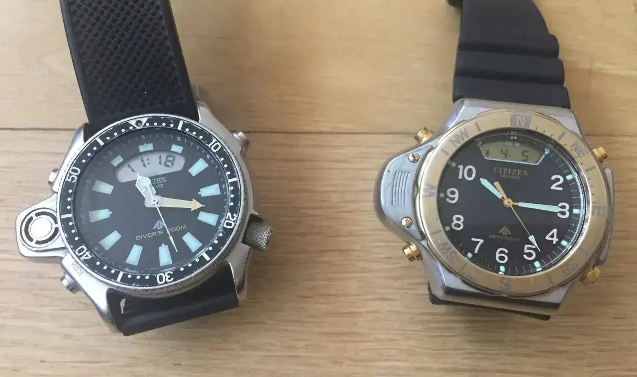 Yo ademas puedo mostrar esta unidad de Citizen Promaster Altichron de 1989. Primer reloj con altímetro y barómetro electrónicos. Calibre Ana-Digo C040 que incorpora multi-crono, barómetro y altímetro hasta 5000m, en intervalos de 10m, caja 100 m de resistencia al agua y brújula solar en su bisel. Mi ejemplar luce en su trasera los cuatro tornillos, al igual que las primeras series del Aqualand.