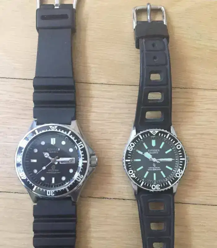 Afortunadamente poseo ambas unidades por lo que puedo mostrarlas juntas, y además en increíble estado NOS como podéis apreciar. En su día el 600m costaba justamente el doble que el 150m, y casi multiplicaba por 4 el precio del Citizen mecánico de 150m del momento. Era la época en la que el cuarzo era el no va más. Fotos de anuncios con precio para el mercado japonés.