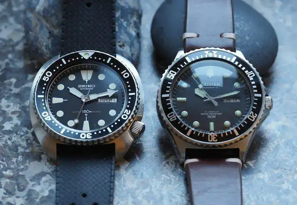 Foto comparativa del Seiko Turtle 6309 y Citizen 51-2273, este último con correa de cuero envejecido. Yo particularmente cuando saco este reloj de la caja para su uso, le adapto una NATO de cuero envejecido color natural muy similar que le queda fenomenal.