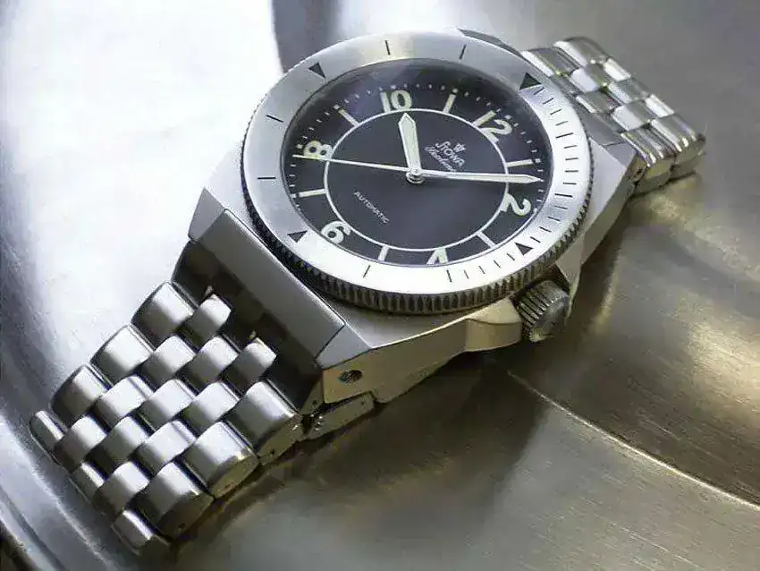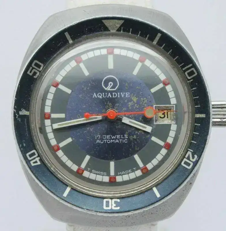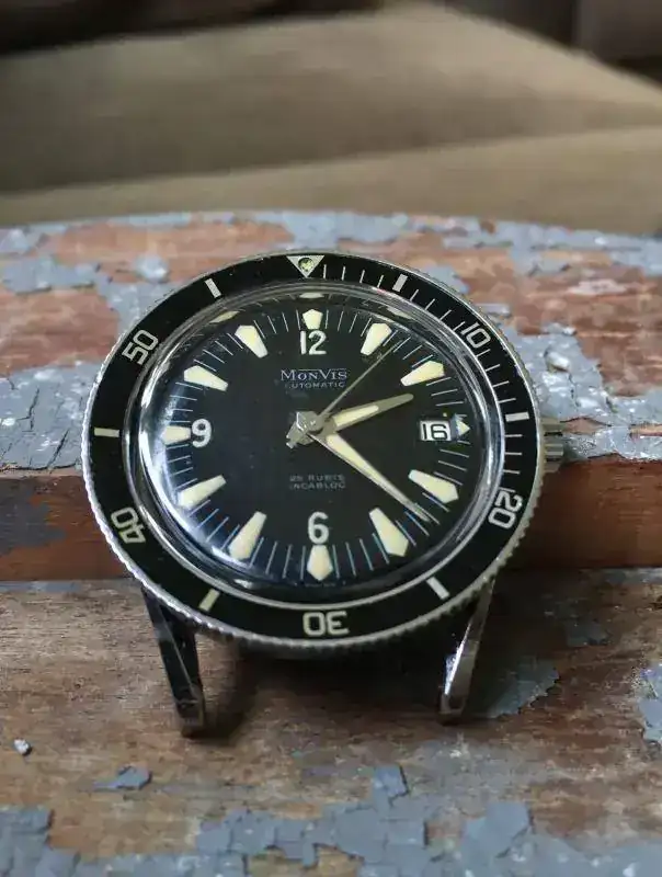 Y si remontamos a los años 70 se pudieron ver en ejemplares como los Aquadive caja Tonneau, cal. ETA 2783 y 200m wr o los Monvis Diver, caja de 38mm y cal. AS1712/3 :
