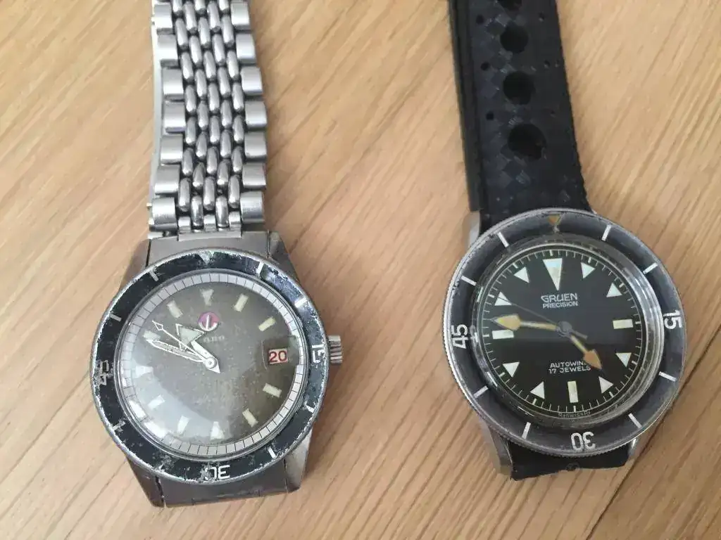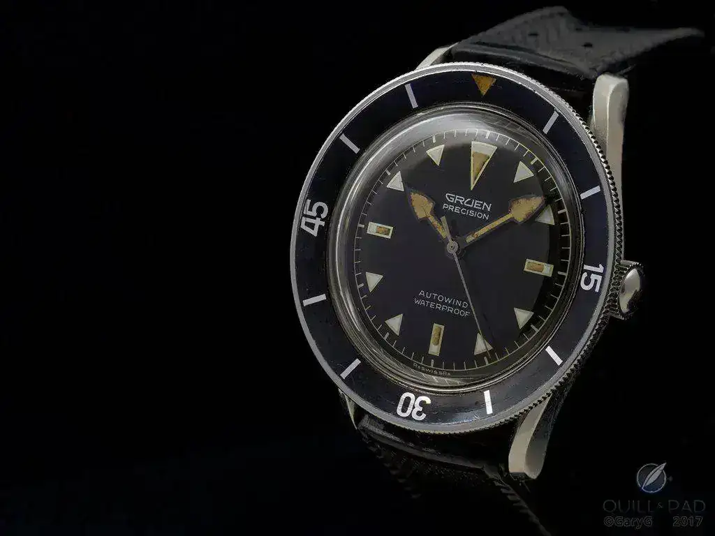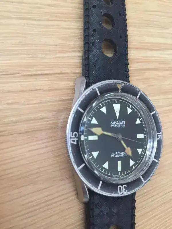 Ese mismo año de 1957, GRUEN lanza su Ocean Chief, con caja de 39mm, bisel cóncavo con marcas "15-30-45" al estilo del BP Fifty Fathoms, y alimentado por su calibre Precisión 560SS. Estos calibres eran muy prestigiosos por su calidad, de hecho el primer reloj que lució James Bond en su muñeca fué un Gruen Precisión 510, y curiosamente esta empresa vendió en 1958 su fábrica a Rolex. Estos años fueron muy difíciles para Gruen, por eso son muy escasos sus modelos Ocean Chief en el mercado y también muy cotizados (aunque sorprenda, a veces superan los 8000€). La empresa acabó desapareciendo. Otra curiosidad de la pieza, es que su lumen pintaba parcialmente con Radio solo una parte de los marcadores, dando lugar a un dial muy particular.[/FONT][FONT="]Otra curiosidad para los aficionados a la historia de los relojes, Rolex y Gruen han ido siempre de la mano, y no solo en su final. Eran los principales clientes de la manufactura de calibres Aegler, han compartido corazón desde el primer momento, de ahí el interés de Rolex por adquirir la fabrica de calibres Precisión de Gruen.