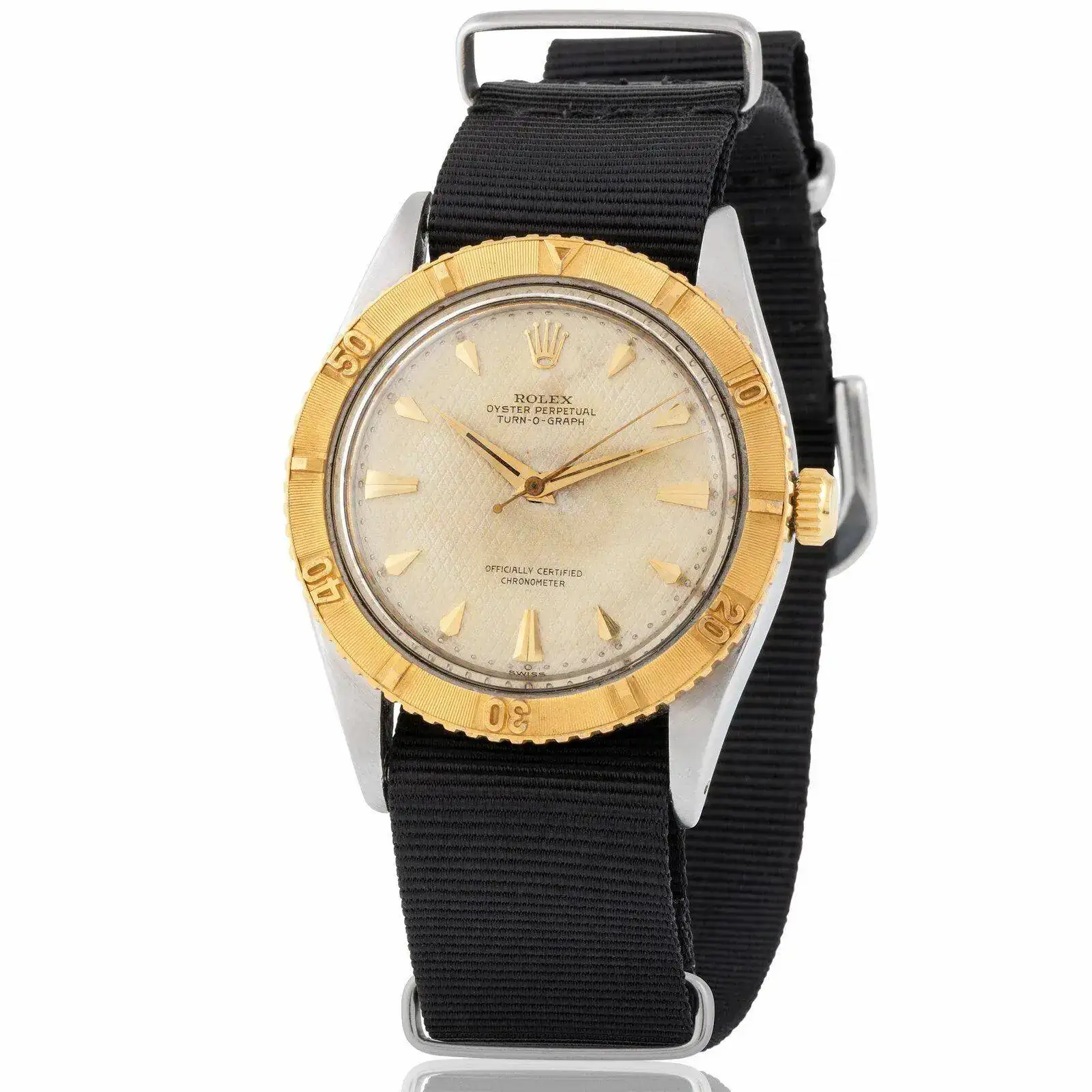 Así mismo, ese mismo año ve la luz el primer reloj con bisel giratorio exterior de Rolex, el modelo Rolex Turn-o-Graph, con una primera referencia 6202, y aunque todos tenemos en mente el diseño de dial y bisel negro en caja de acero de 36 mm con una resistencia de 50m, que luego se continuará en los “submariner”, Rolex también produjo la misma referencia con un dial plateado en panal de abeja, con marcadores de oro y bisel exterior 10-20-30-40 y 50 en oro amarillo de 18kt. Ese mismo diseño inspirará años después a otras firmas, como veremos más adelante.