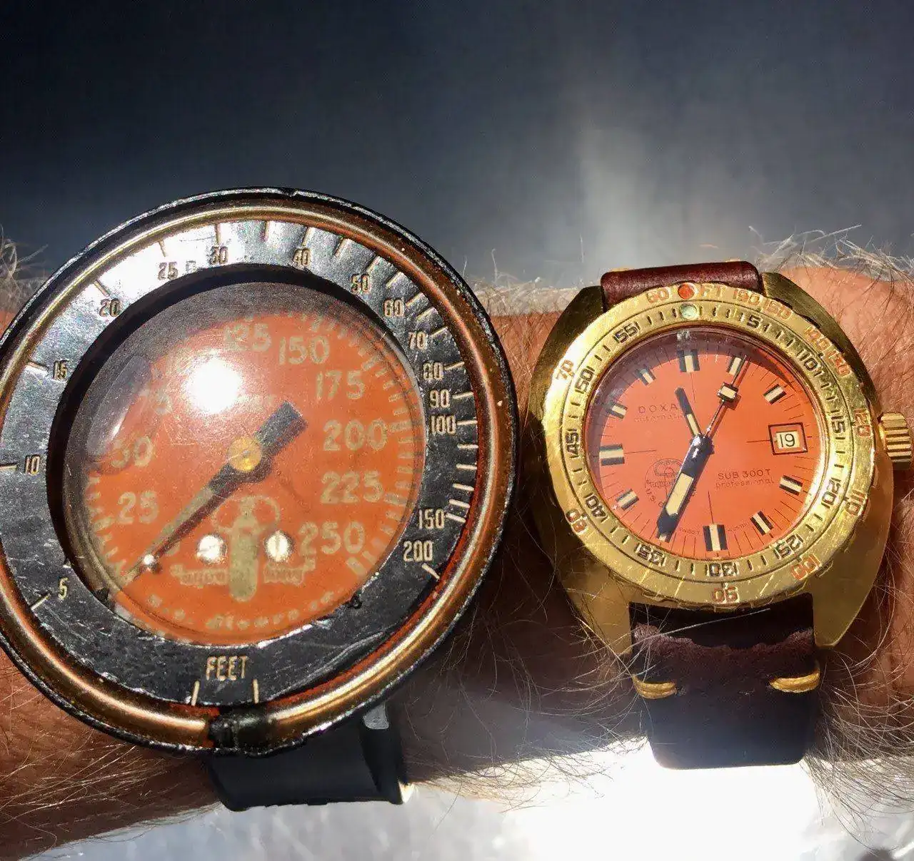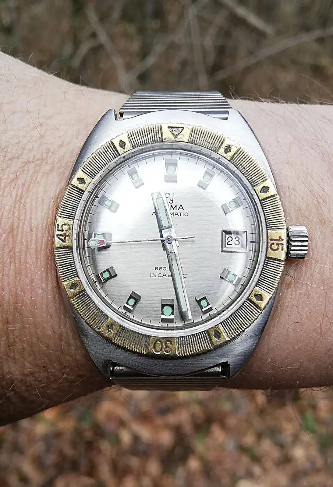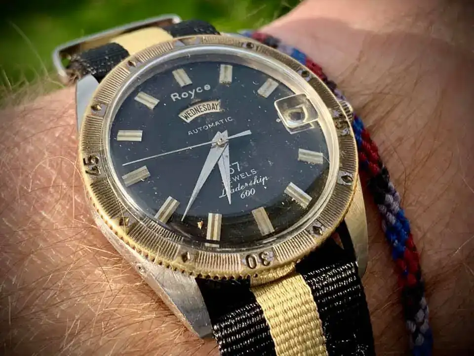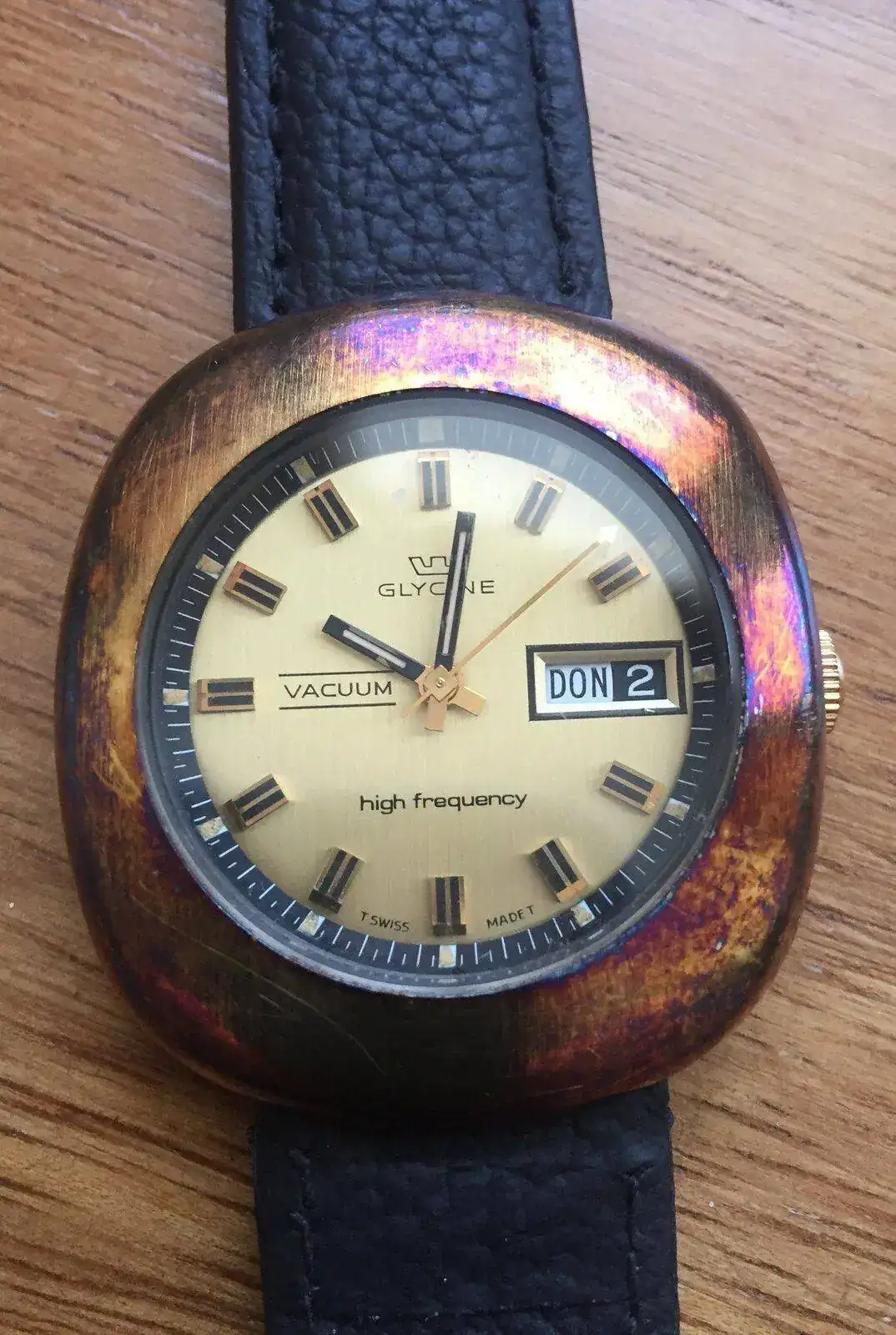 Otro reloj rarito, es este Glycine Vacuum, con su sistema de doble caja de 40 mm “Vacuum” que garantiza estanqueidad frente a agua y polvo, en este caso la caja exterior esta acabada “Gold plated” de altísima calidad de 20 micrones, donde se ve la patina por falta de limpieza adecuada, pero que como creo que le da carácter, dejo que permanezca. Esta alimentado por calibre de alta frecuencia automatico y una correa tipo piel de tiburón, todo un formula uno de la relojería de los 70´s.