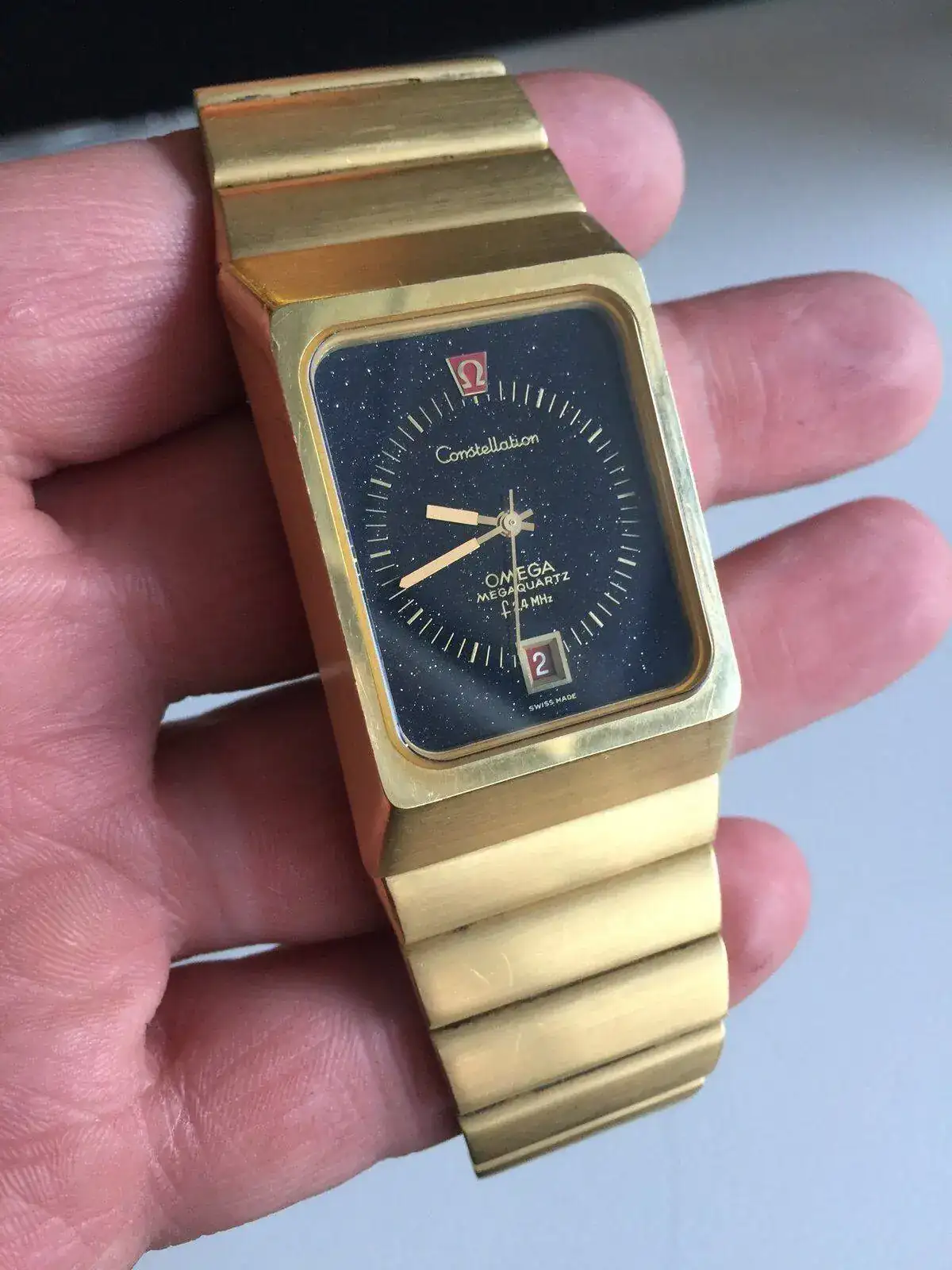 En 1975, otra firma tradicional, en esta ocasión OMEGA se atreve con el oro para adornar sus increíbles calibres Megaquartz. En esta ocasión se reserva el oro macizo para todo el reloj en una serie de Omega Constellation Megaquartz, y sólo el empleo de marcos y detalles en oro de 14kt. en su Marine Chonometer y sus Seamaster Mariner II.