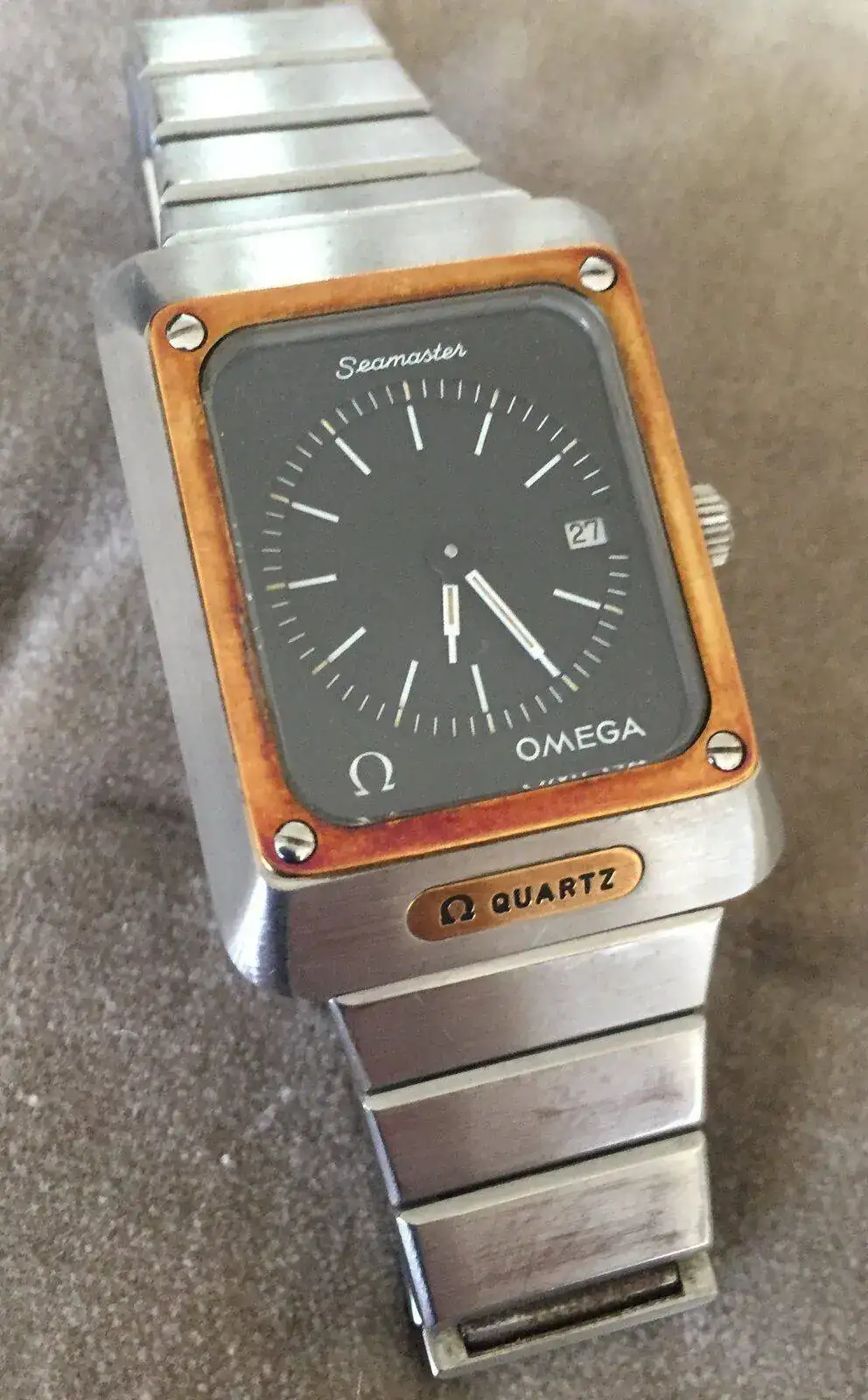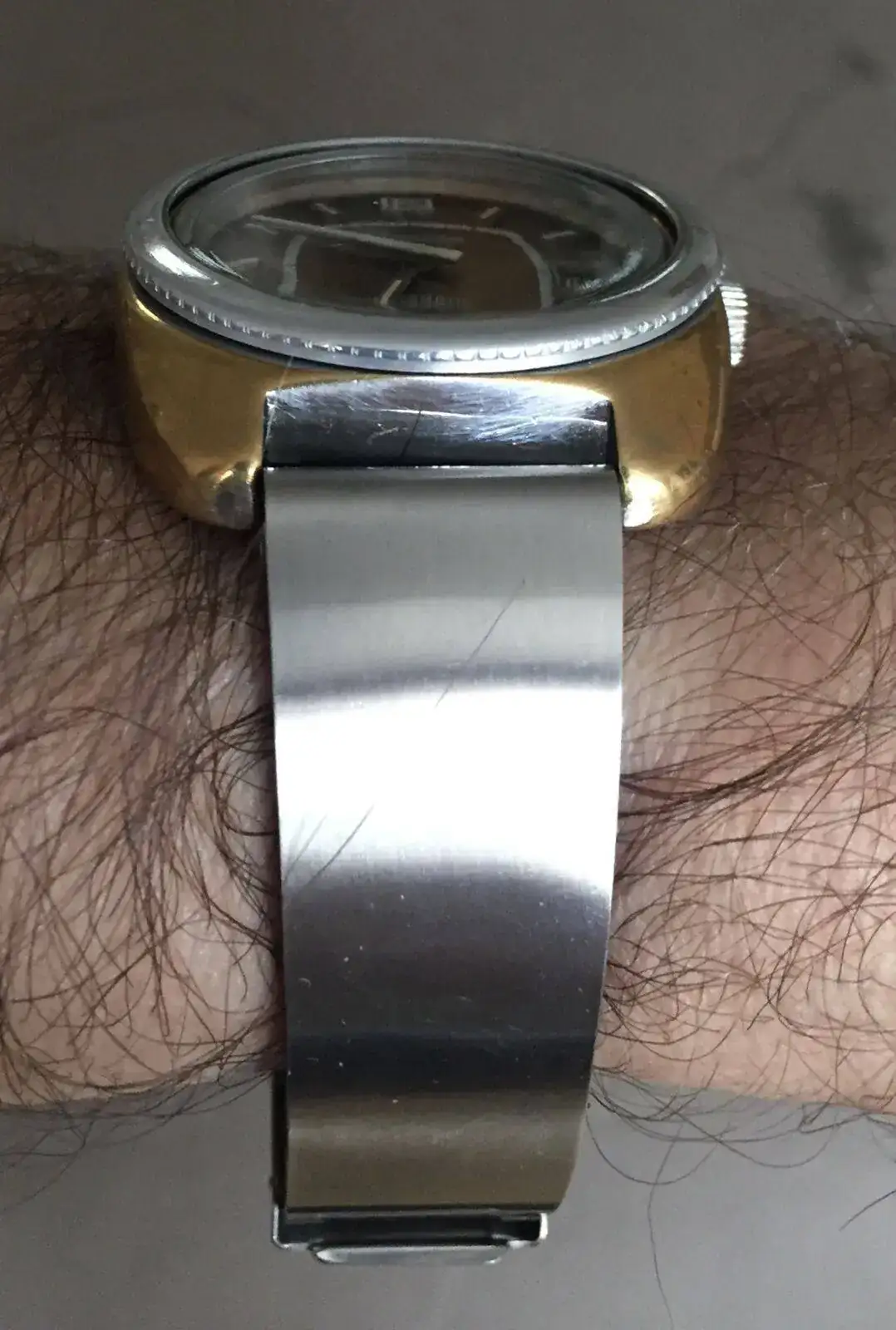 Esta unidad es mía y corresponde a un Seamaster Mariner II, y se ve muy bien el aspecto que adquiere con el tiempo el revestimiento de oro de 14 kt del marco, debido a la baja cantidad de oro en la aleación frente a otros metales que se oxidan.