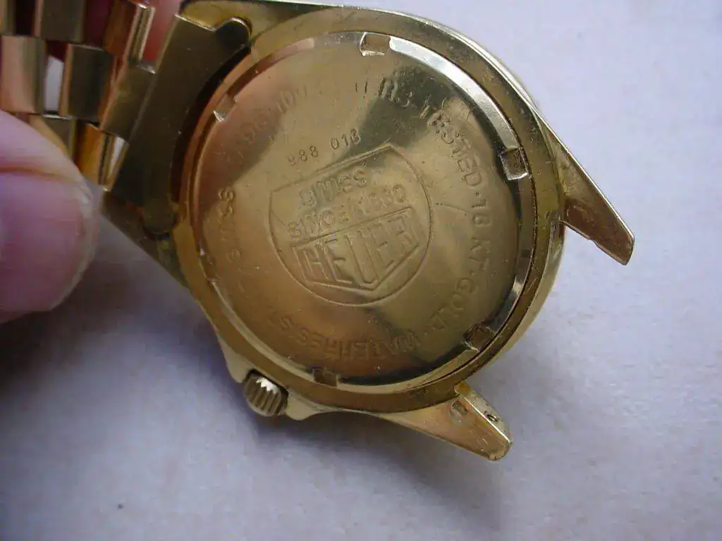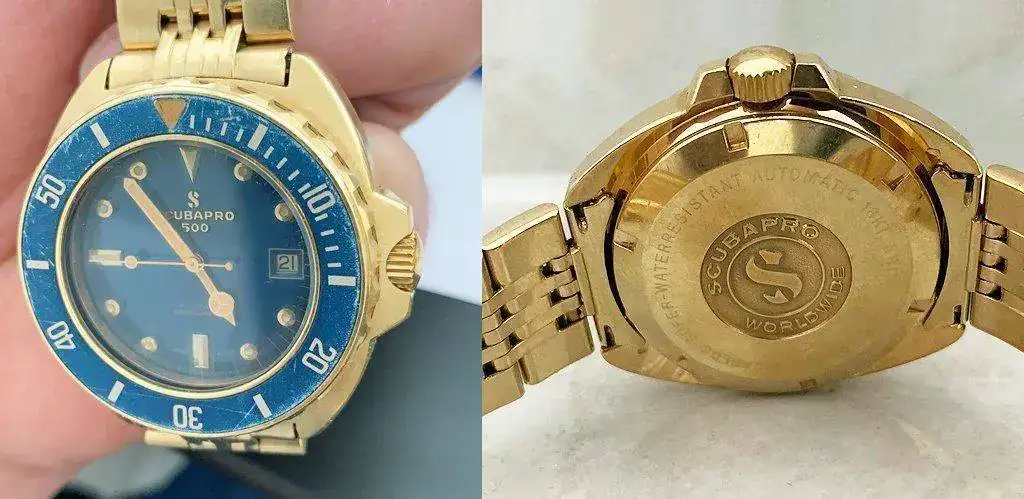 Dejamos ahora el oro macizo, para centrarnos en los “Gold filled” o “Chapados en oro” y “Gold plate”, que si bien ahora son sinónimo de algo barato incluso pobre, hace años eran trabajos muy costosos y cotizados, donde incluso los relojes incluían el punzón o marca del especialista que había realizado el recubrimiento. De hecho esos recubrimientos de calidad, con espesor de hasta 20 micras, resisten perfectamente el paso del tiempo como vamos a poder apreciar. No debemos confundir estos “chapados” con los baratos “bañados en oro”, donde la capa apenas alcanza media micra y su deterioro es rápido. Por eso algunas firmas se atrevieron a emplearlo en relojes deportivos como los “diver”, aunque no es lo ideal sobretodo por el cloro de las piscinas o la sal del mar que afecta más al recubrimiento.
