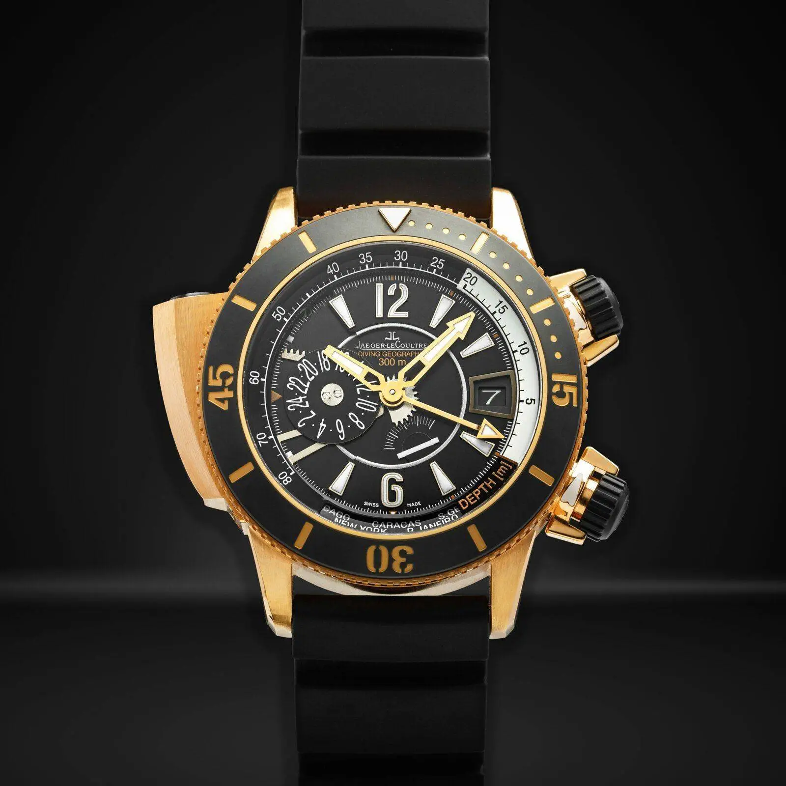 Pero estos detalles exteriores accesorios en oro macizo de 18kt., no son nada comparados con el primer reloj de buceo fabricado íntegramente en oro de 18kt. en 1968. Se trata del rarísimo Doxa SUB 300T fabricado por el 25º aniversario de la creación del sistema Aqua-Lung por Cousteau.