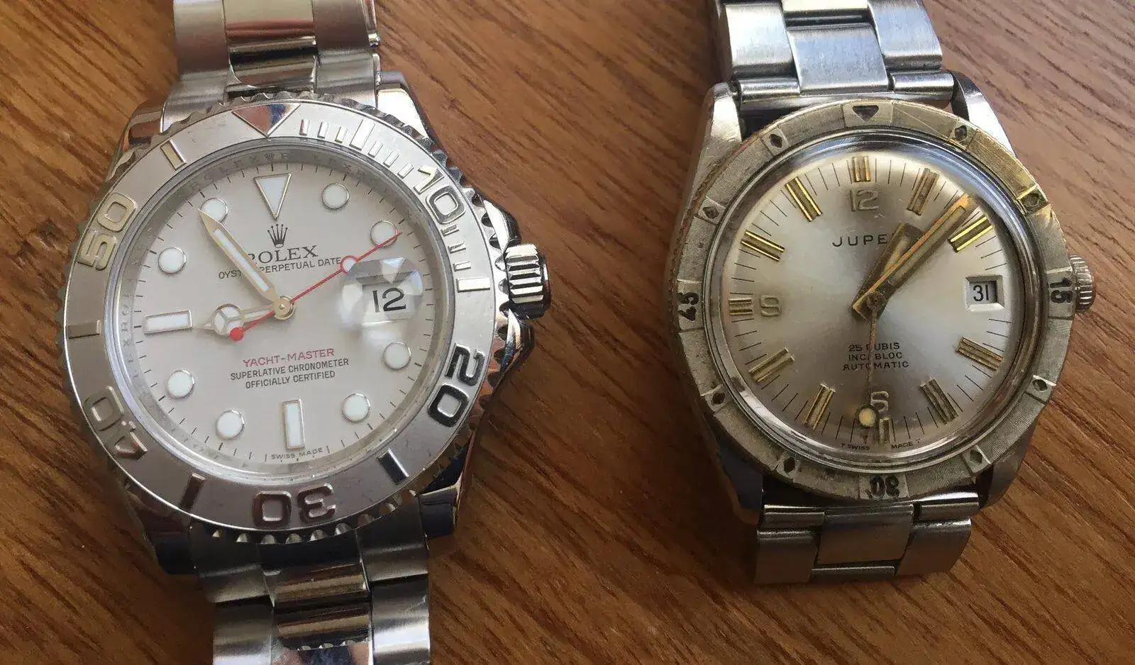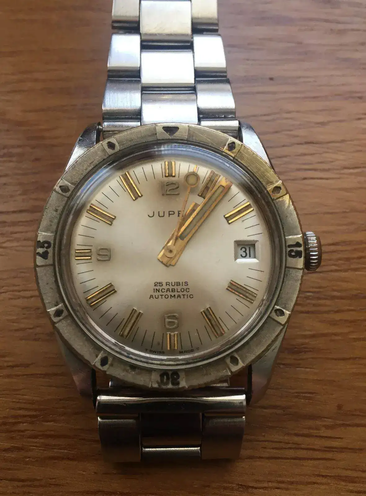 Aquí son varios los modelos que puedo mostrar de mi colección, empezando por un atractivo JUPEX con caja de acero de 36 mm testada para 150m, calibre automático ETA 2522 y un dial y bisel dorado que recuerdan al Rolex 6202 en el que se basan, si bien el dorado del dial y sus agujas en bastones anchos y segundera Lolli-Pop le confiere una estética algo más personal.