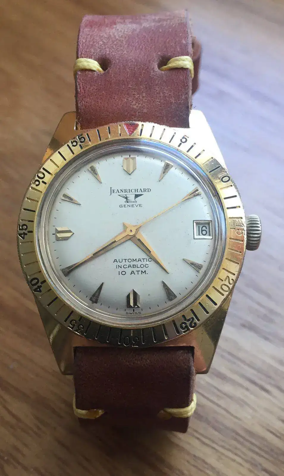 Ahora continuo con una rareza, como apreciarán los aficionados a los Aquastar, es este Jean Richard pre-Aquastar, con caja diseño skin-diver de 100m de 37,5 mm, pero bañada en oro y con la trasera en dos piezas diseño Blancpain como los primeros Aquastar . Este modelo incluso incorpora el grabado de serie entre asas típico de los primeros Aquastar y por otro lado “55”, que puede corresponder al año de 1955. Todo un hallazgo que comparto por primera vez en el Foro. Es la única vez que lo he visto y por eso no lo pude dejar escapar.