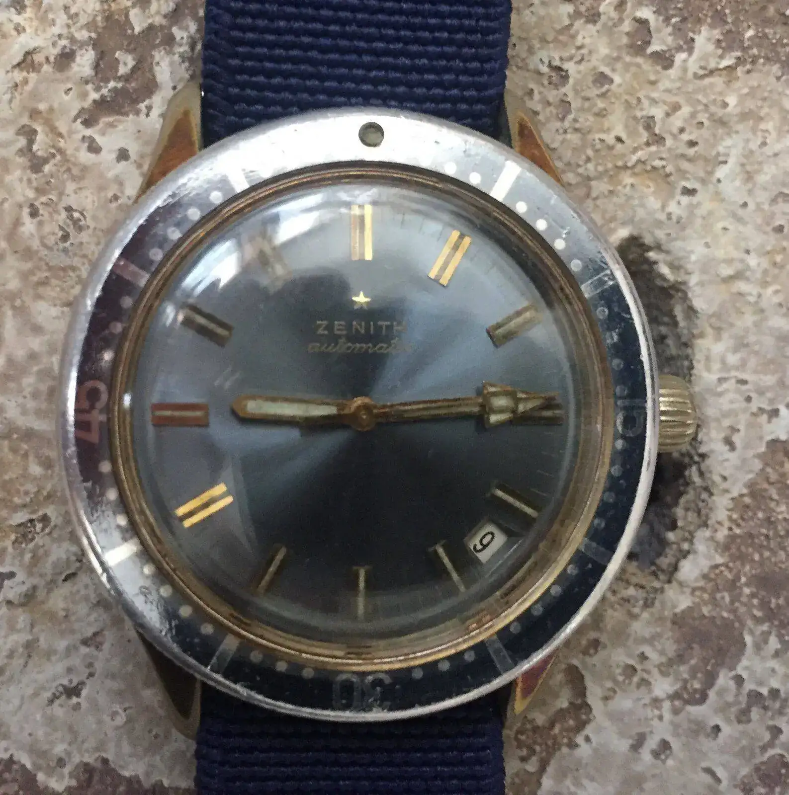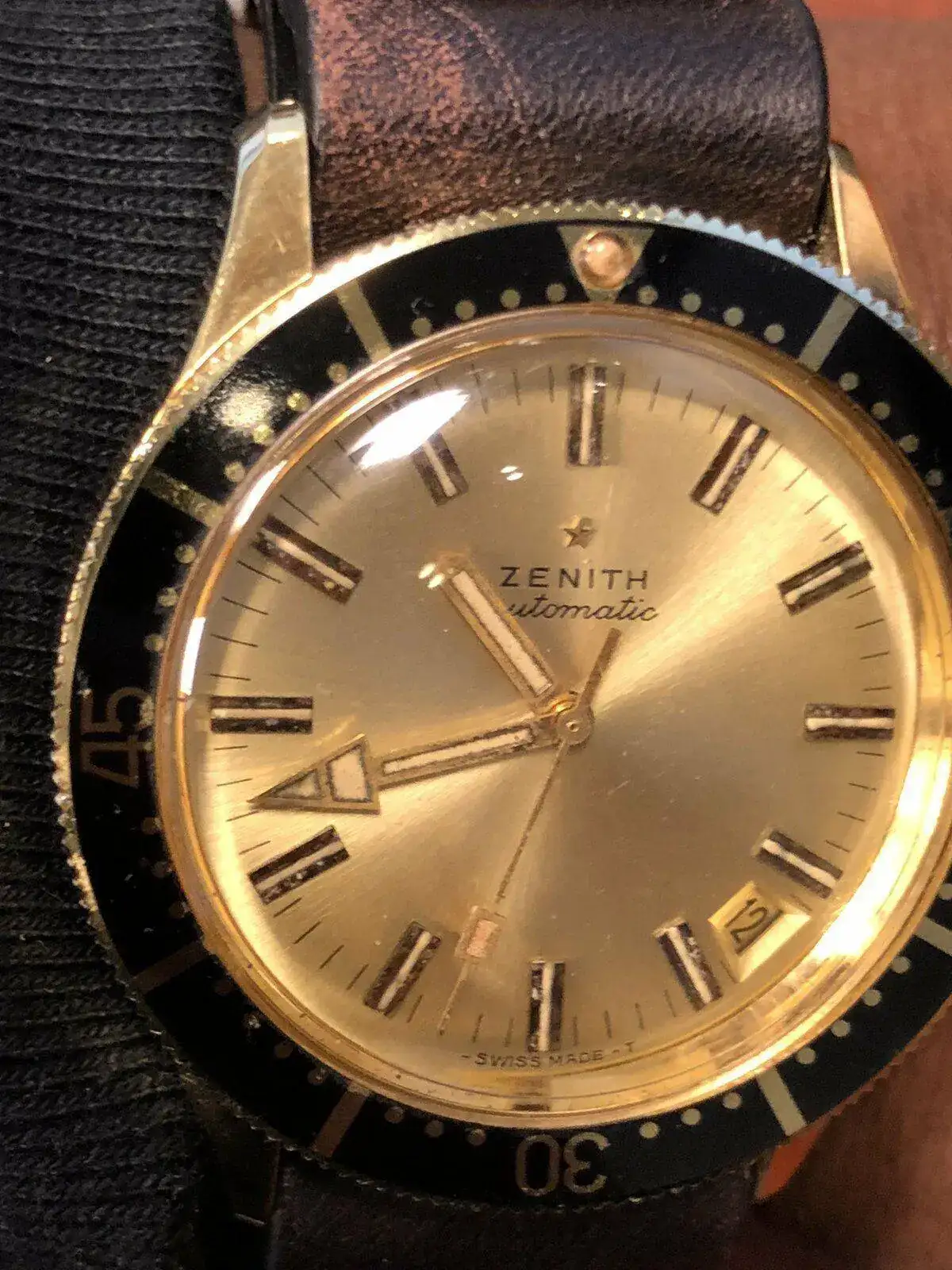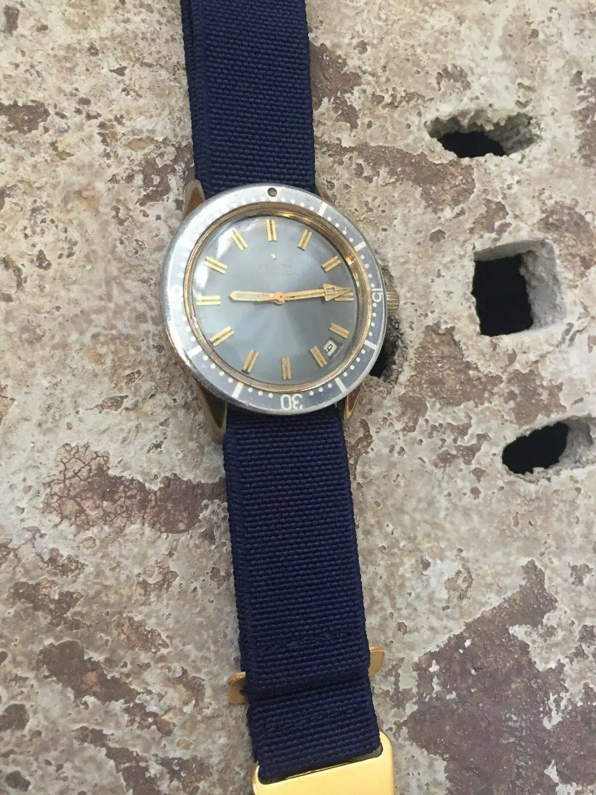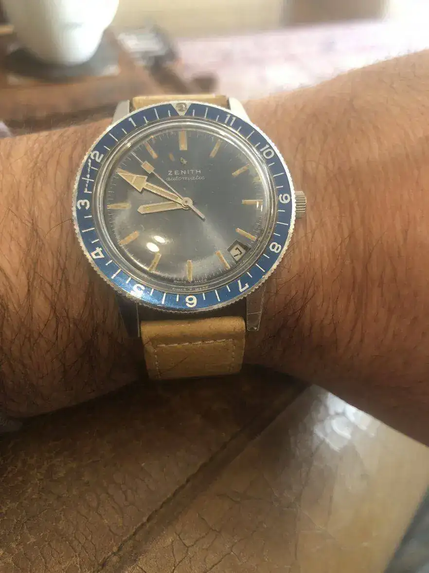 Sigo ahora con otra pieza muy especial, un Zenith A 3634 de los primeros años 70´s, que si bien tiene en la versión de acero su forma más conocida, también se fabricó en una espectacular caja “chapada en oro” y un atractivo dial y bisel azul , como es este caso; aunque sin embargo suelen mostrar mayores señales de deterioro de sus casi 50 años.