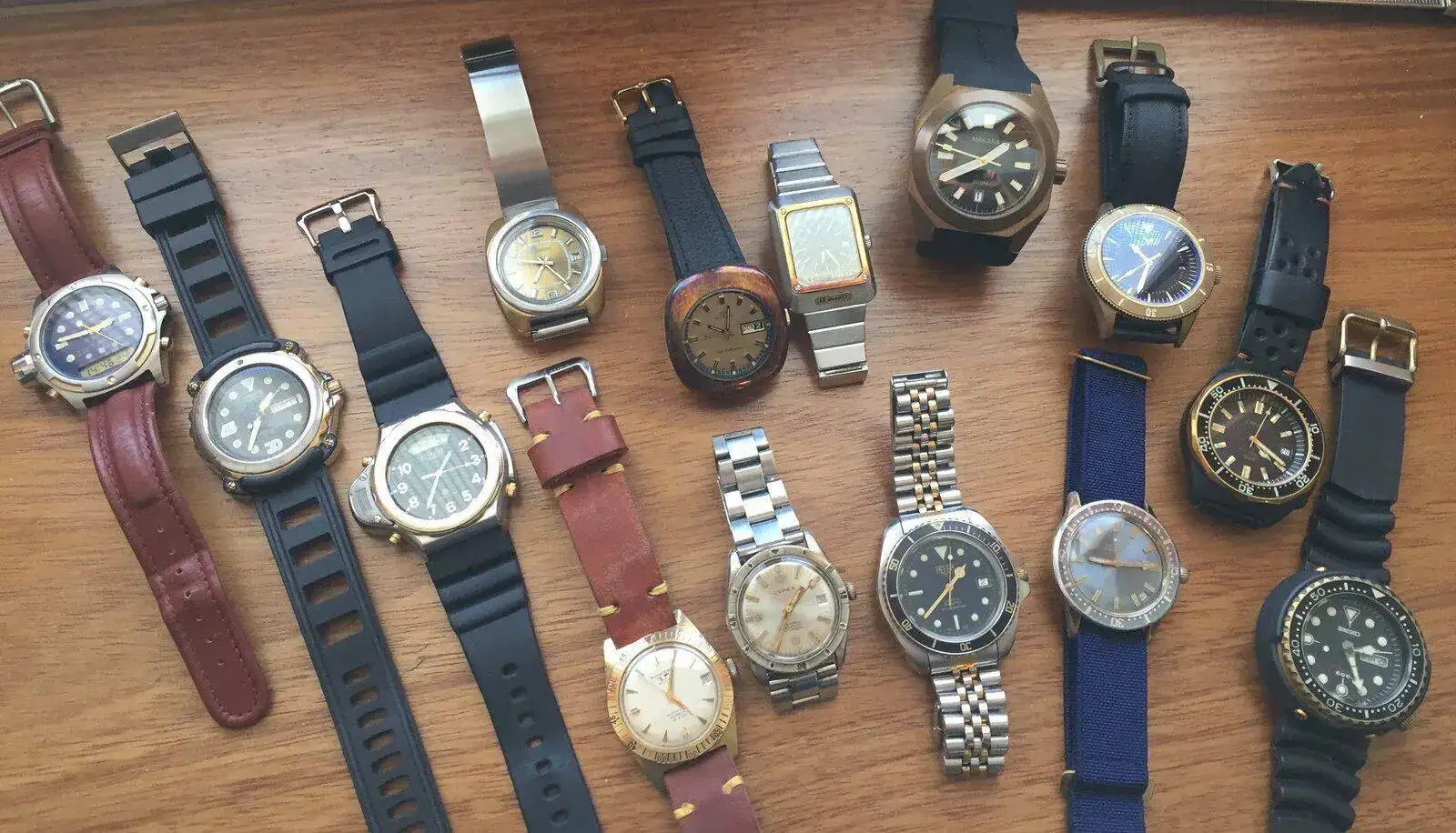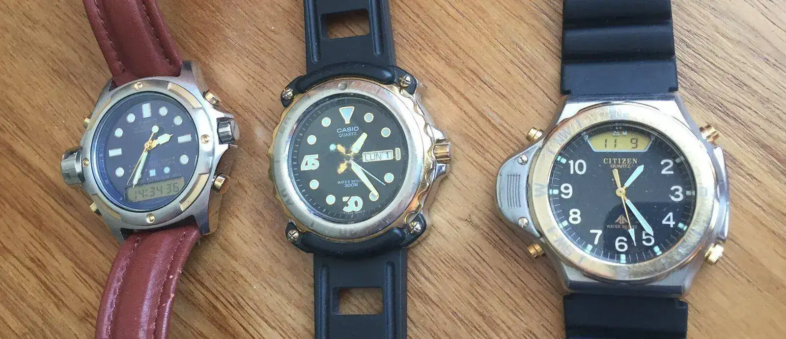 En esos años muchos relojes japoneses deportivos incluían, sobre todo en los biseles , detalle bañados en oro, para dotarlos de un aspecto de mayor calidad, como estos ejemplos : Citizen Promaster de 1989, Casio Alti-Depthméter AW-700 de 1989, MD-709, diver 300m de 1990.