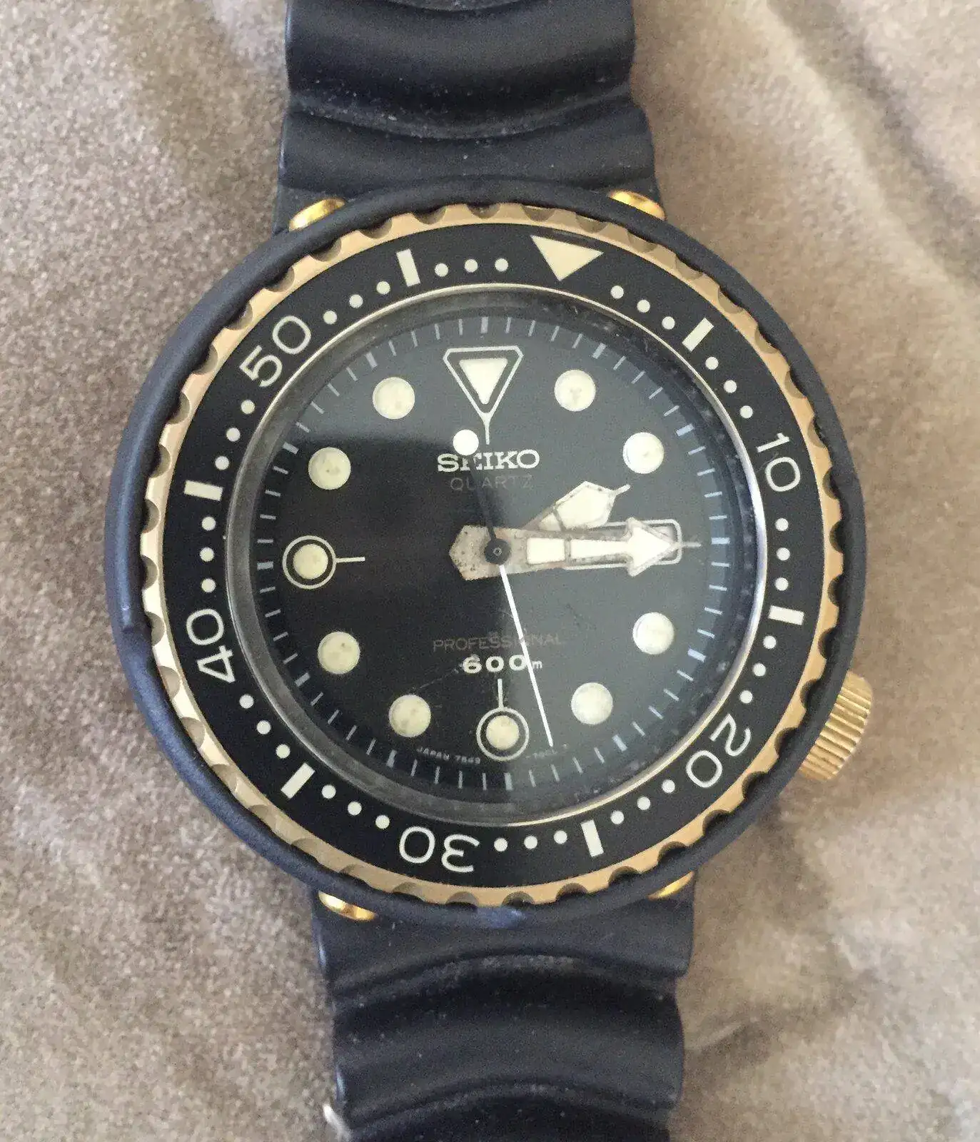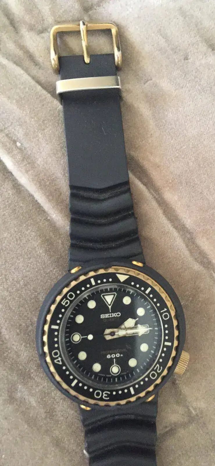 Aunque ahora debo retroceder unos años, hasta 1978, y presentar a un mito dentro de los relojes “diver”, que en su momento era el no va más de la tecnología en relojería de buceo, me refiero al Seiko GOLDEN TUNA Ref. 7549-7000, donde su imponente caja de titanio de 49mm se ve reforzada con un novedoso recubrimiento que dota de una dureza de resistencia extrema, me refiero al Nitruro de Titanio. De hecho , el uso más frecuente de este recubrimiento es en fresas e instrumentos de perforación de máxima dureza. Este reloj además incorporaba resistencia de 600m sin necesidad de válvula de helio y calibre cuarzo de alta gama. El no va más del que presumía James Bond y Roger Moore en sus películas.