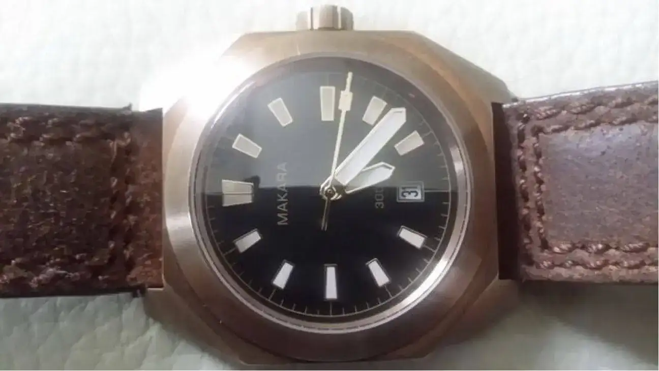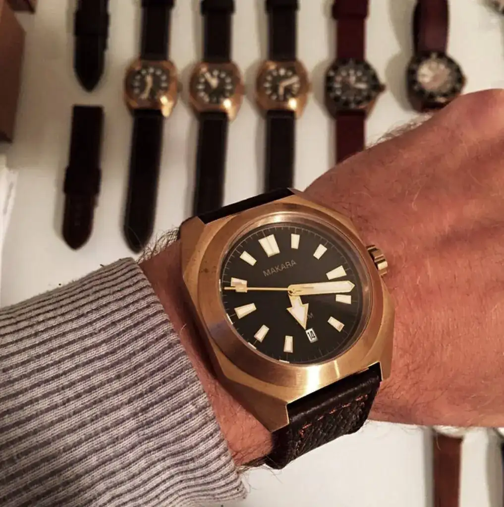 MAKARA es una micromarca canadiense pionera en emplear cajas mecanizadas a partir de un bloque de auténtico bronce CuSn8. Este es su modelo “Sea Turtle”, un enorme diver de 44 mm de diámetro y 52mm entre asas, con un cristal de zafiro grueso en cúpula y una resistencia de 300m; alimentado por un fiable Seiko NH35a. Este tiene un tamaño que ya no es para todos los públicos, así que se debe probar antes de comprar.