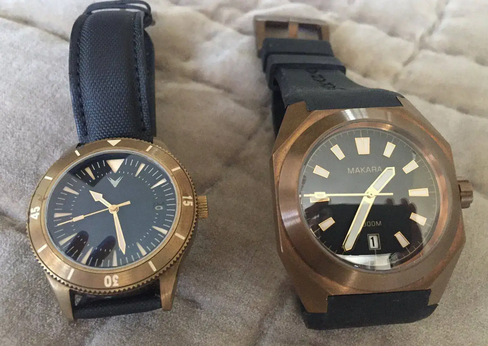 Y por último llegamos al empleo de otras aleacciones de color más o menos dorado, como son el latón “Brass” (Cobre y Zinc, con color más dorado) y sobretodo el “Bronce” (Cobre y Estaño, de color más oscuro), que si bien se habían empleado desde hacía miles de años para fabricar instrumentos y herramientas (5500 años para el bronce hallado en Tailandia), se abandono en relojería hace mucho tiempo y últimamente esta volviendo al mercado y va ganando muchos adeptos. Aqui voy a presentar dos modelos de mi colección que además son pioneros en la reintroducción de estos materiales en relojería, el Ventus Mori Brass y el Makara Sea Turtle 300m.