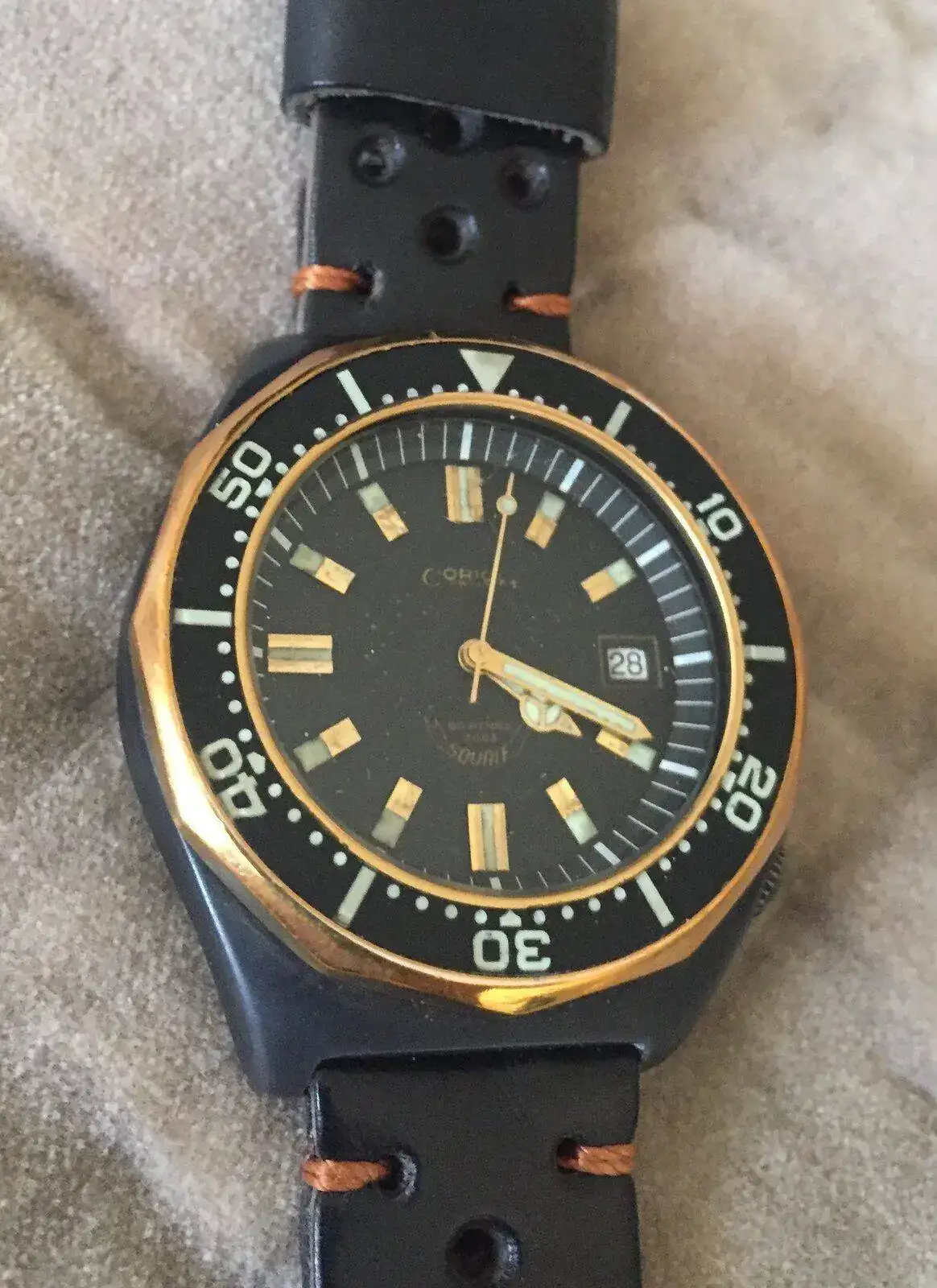 Yo tengo este Corich Squale 50 Atmos que presenta un bisel en Cuproaluminio y caja en PVD negro, otro recubrimiento novedoso en su momento. Debe ser de los primeros modelos es usarlo, pues es un reloj de 1980.