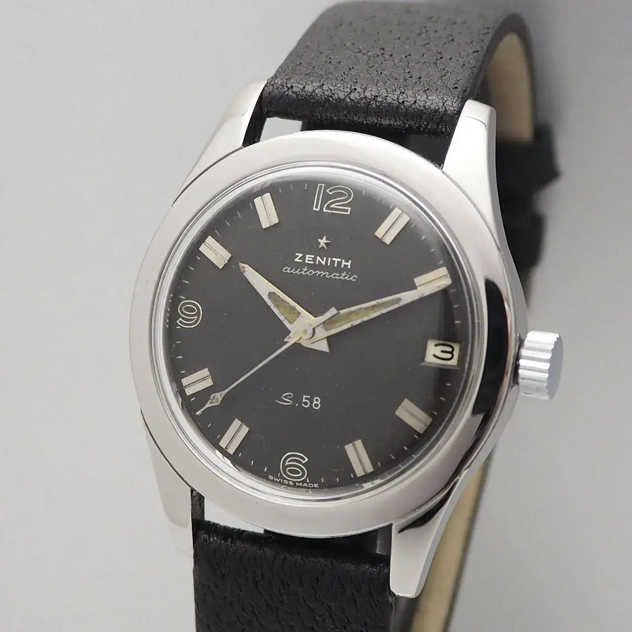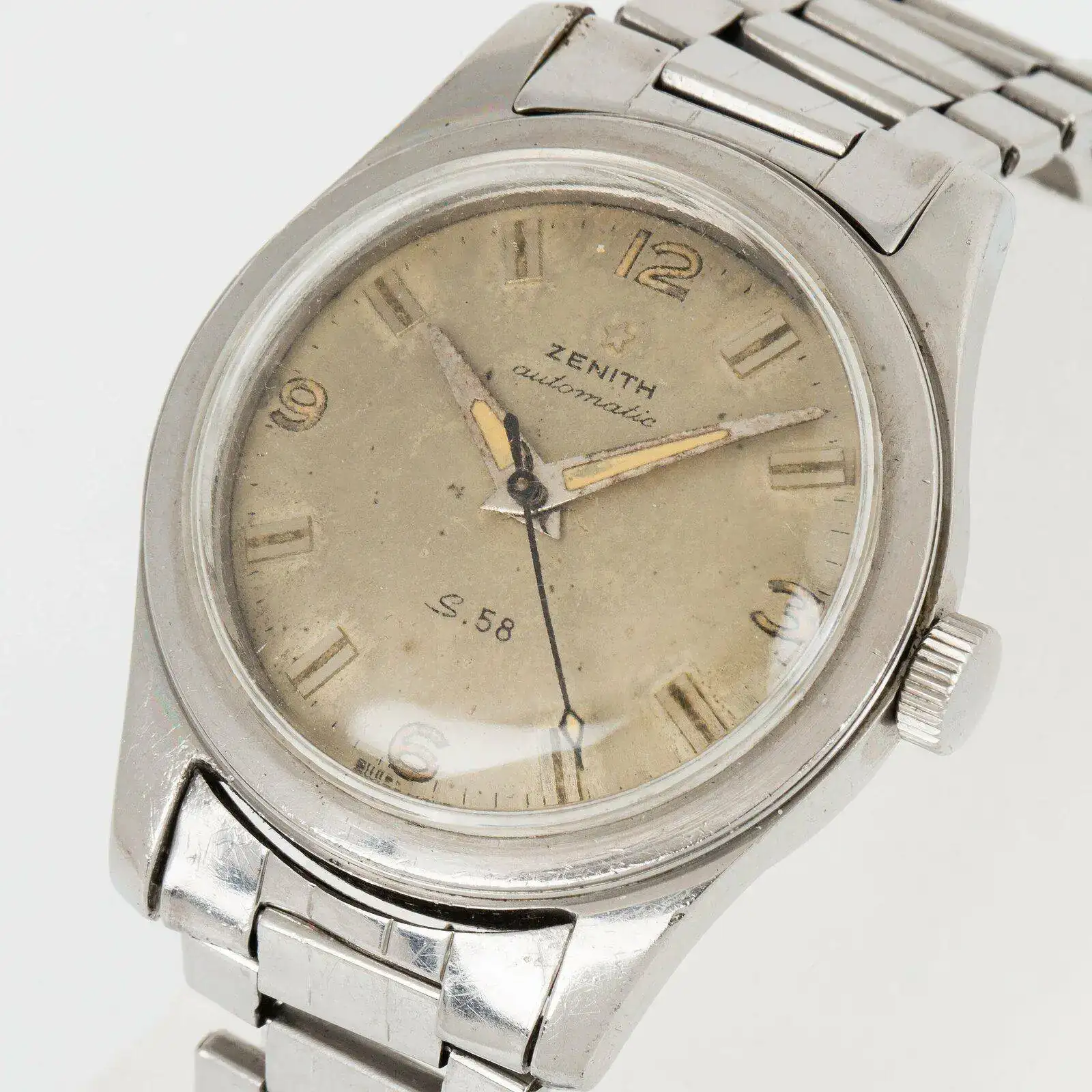 Respecto al mítico Zenith S58, aparecido en 1958 no voy a extenderme mucho, pues es conocido por todos; solamente recordar que las primeras dos series venían en cajas de 36,5 mm y carecían de bisel exterior. Además sus agujas eran más tipo dauphine que las de versiones posteriores.