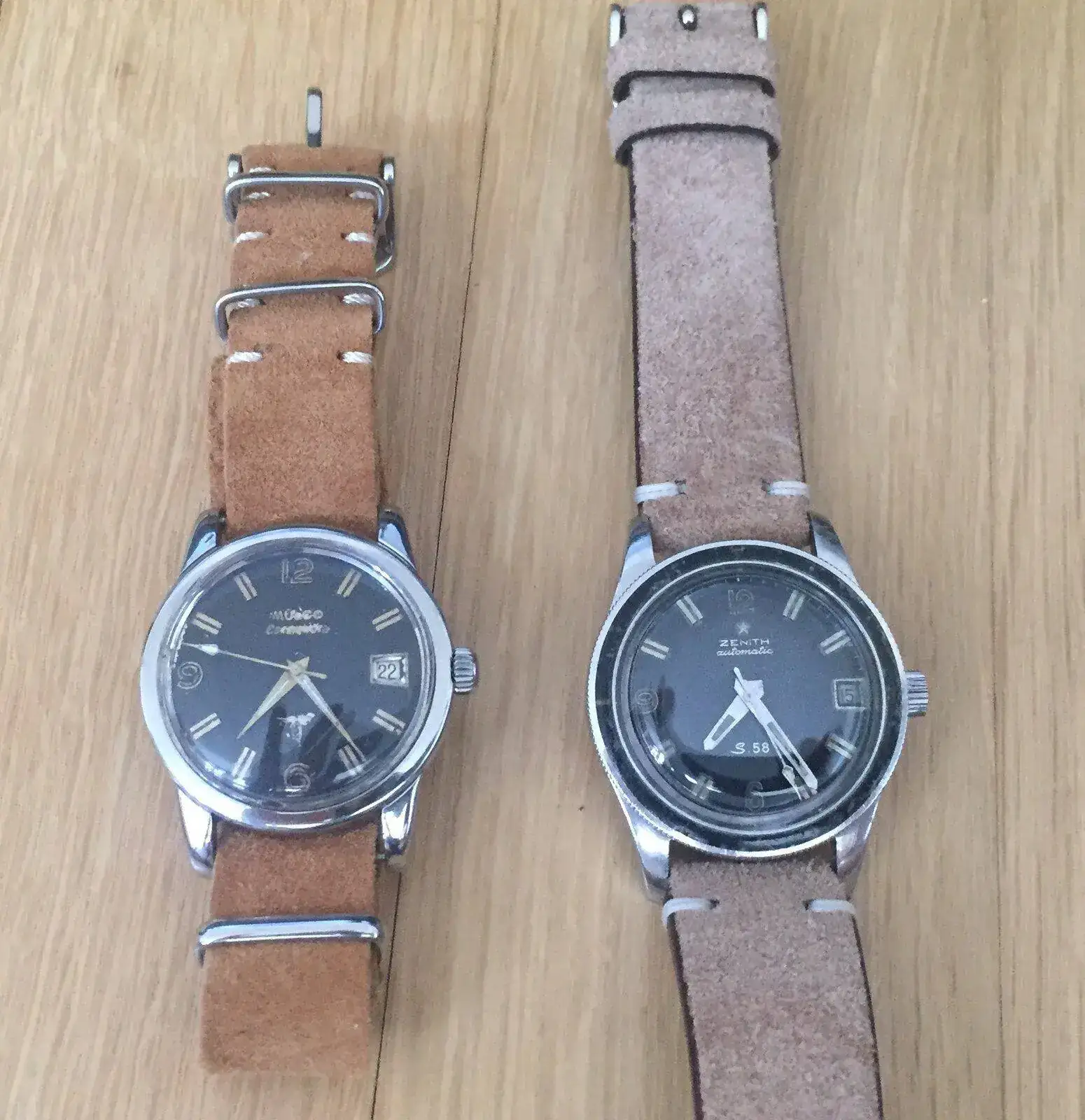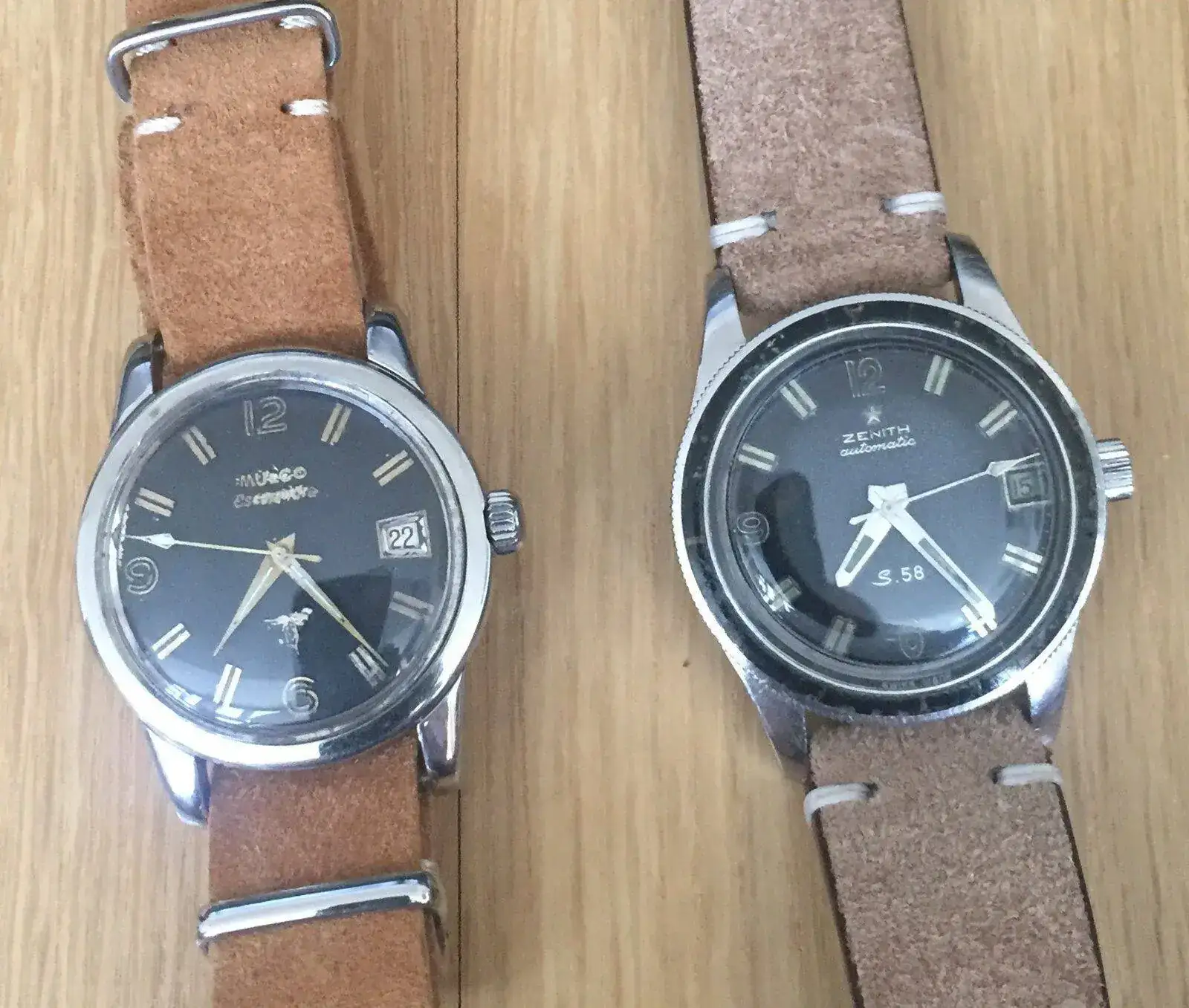 El caso es que desde hacía años veía un parecido enorme entre los diales de estos relojes con los de los cotizados Zenith S58, y ahora al tenerlos a ambos juntos puedo concluir que estos relojes son algo más que parecidos.