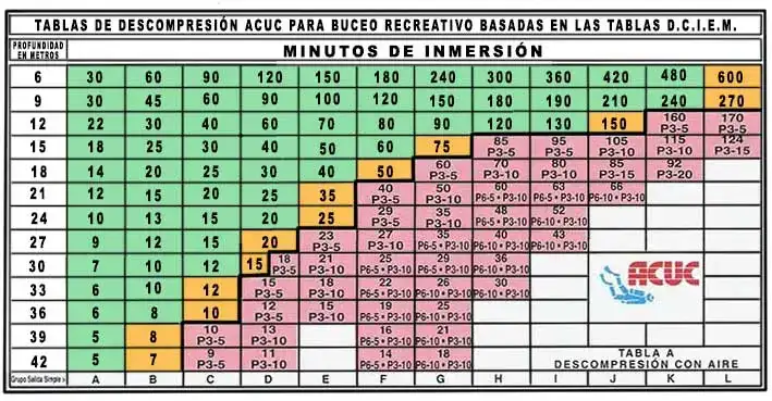 Esas tablas lo primero que ofrecen es la llamada “Curva de Seguridad”, es decir tiempos y profundidades donde se puede bucear y ascender SIN necesidad de realizar descompresión (No Decompression Limits : ND LIMITS). Aún así, seguirá siendo recomendable la llamada “Parada de Seguridad”, que consiste en una parada de 3 minutos a 5 metros de profundidad, y subir luego de forma lenta a superficie, mantenerse siempre por debajo de los márgenes de esta Velocidad de Ascenso especialmente en los últimos metros, es fundamental para garantizar la seguridad del buzo.