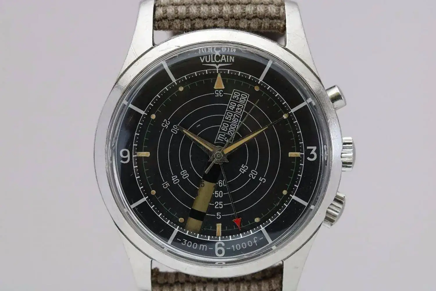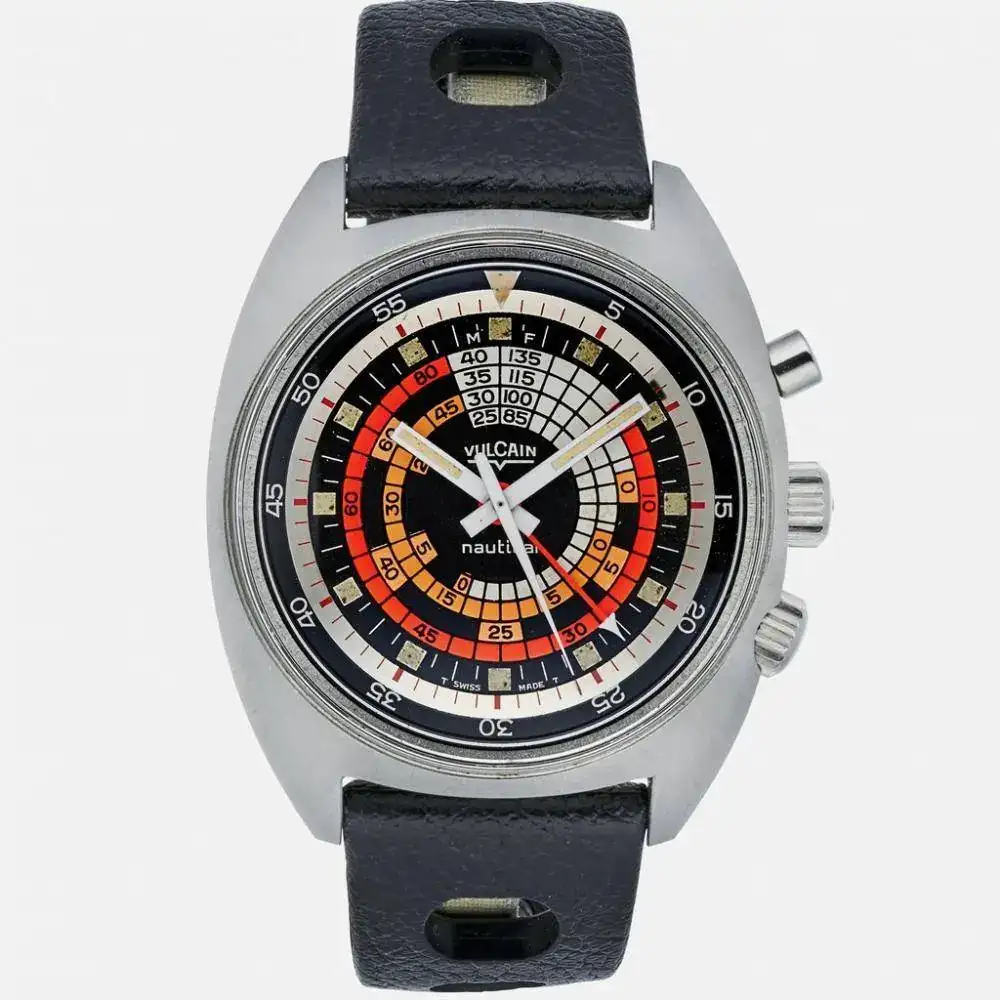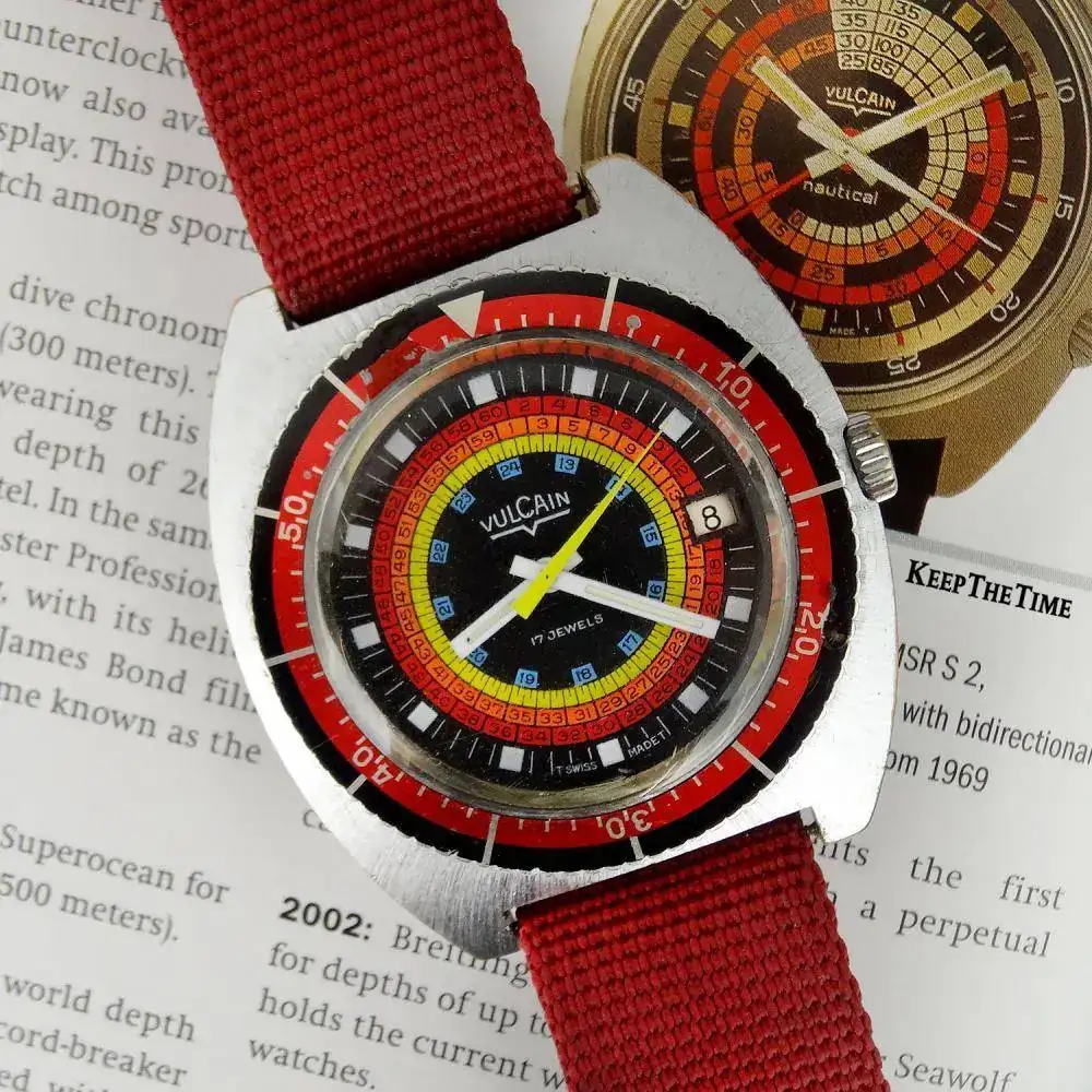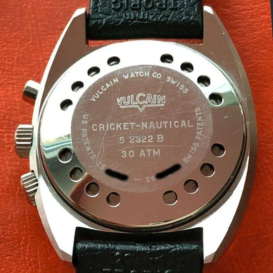 Vulcaín utilizó esta idea de dial a la hora de renovar su Nautical en 1969, evitando la necesidad de la ventana en el dial que mostraba los tiempos de descompresión y simplificando el calibre. Así verá la luz la referencia Vulcain Cricket Nautical S2322, con caja SC de 42 mm y 300 metros de resistencia y el calibre Vulcain 120 modificado con alarma.