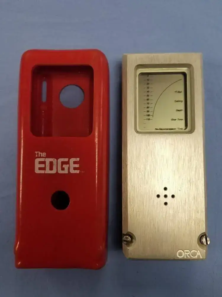 1983; Orca EDGE. Primer ordenador de buceo accesible comercialmente al público; pero con una limitada capacidad de producción de 1 unidad al día. Además No calcula las paradas necesarias DC. Su tamaño y diseño nos recuerda a los primeros Ipod.