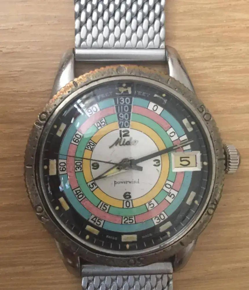 Afortunadamente si dispongo de un ejemplar del segundo reloj que lució una tabla de descompresión en su dial : Mido Powerwind Ocean Star Diver 1000ft (Mido 5907 “Rainbow”). Este reloj salió en 1959 y se fabricó hasta 1965. Contaba además con una contundente caja monobloque de 38 mm resistente a unos increíbles 300 m. Su calibre era un AS 1717 y su tabla de descompresión incluían colores para facilitar su lectura respecto a la monocromática del Cornavín. Mi unidad es “MK2”, es decir fabricada entre 1961 y 1965, incorporando el calibre MIDO 1137OC con fecha y dial “Black”. Uno de esos relojes que uno nunca sabe cuándo lo podrá tener al alcance.
