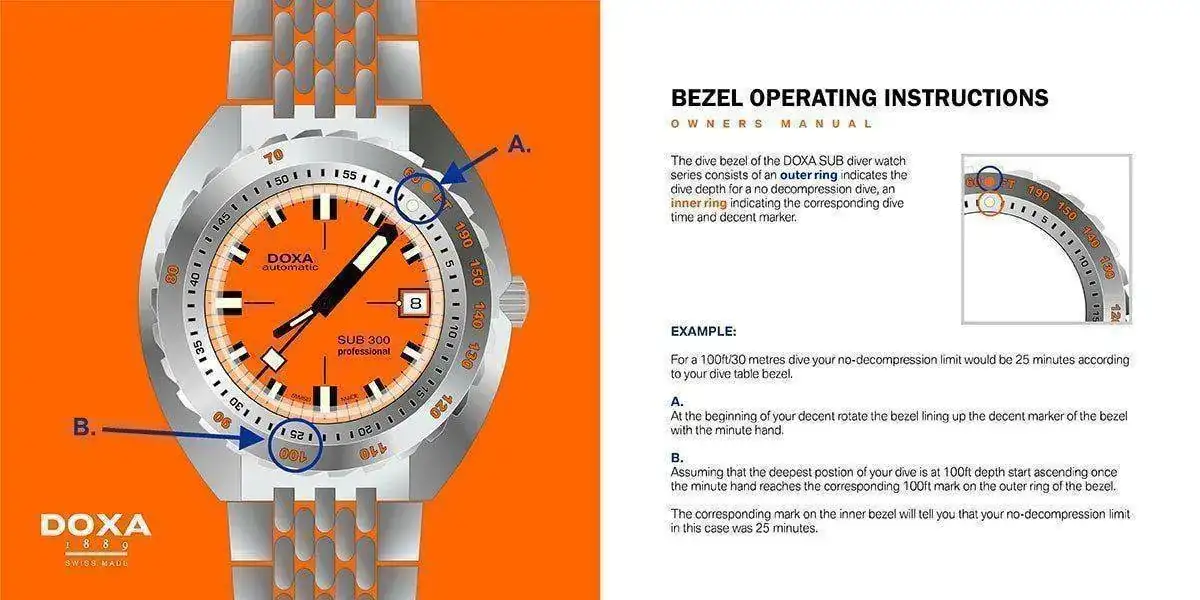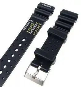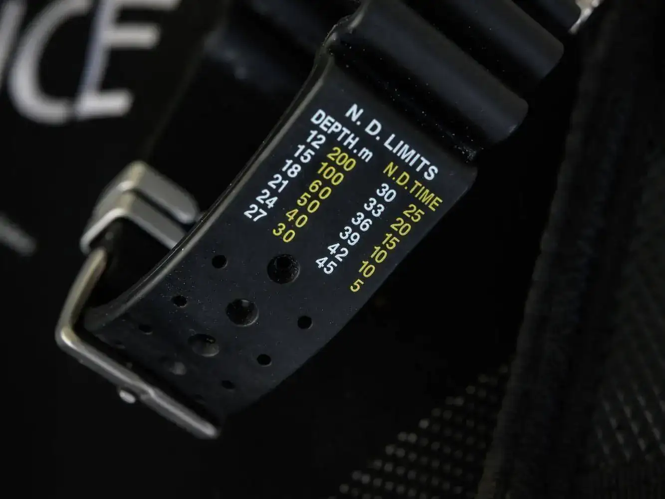 Esta correa tiene unos pliegues que permite autoadpatarse al uso con neoprenos sin necesidad de extensiones, y ademas una Tabla de Tiempos máximos de buceo a diferentes profundidades SIN necesidad de hacer Decompresión basada en las Tablas de la US NAVY Diving Manual; por eso la denominación “No Decompresión Limits”. Esos límites van desde los 200 minutos a 12 metros (40 ft), a los 5 minutos a 45 metros (150 ft), en intervalos de 3m en 3m (10 feet).