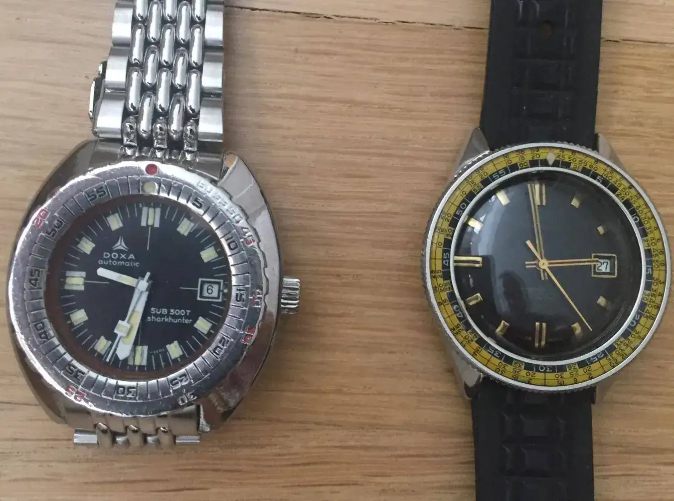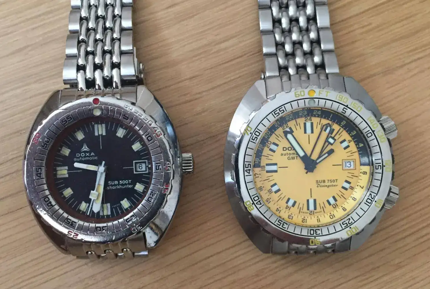 En esta ocasión si puedo lucir dos relojes Doxa con sus biseles “No Deco”, uno vintage “pata negra”, Sub 300T Sharkhunter, y uno más actual “Sub 750T GMT Diving Star” con un preciso ETA 2893-2.