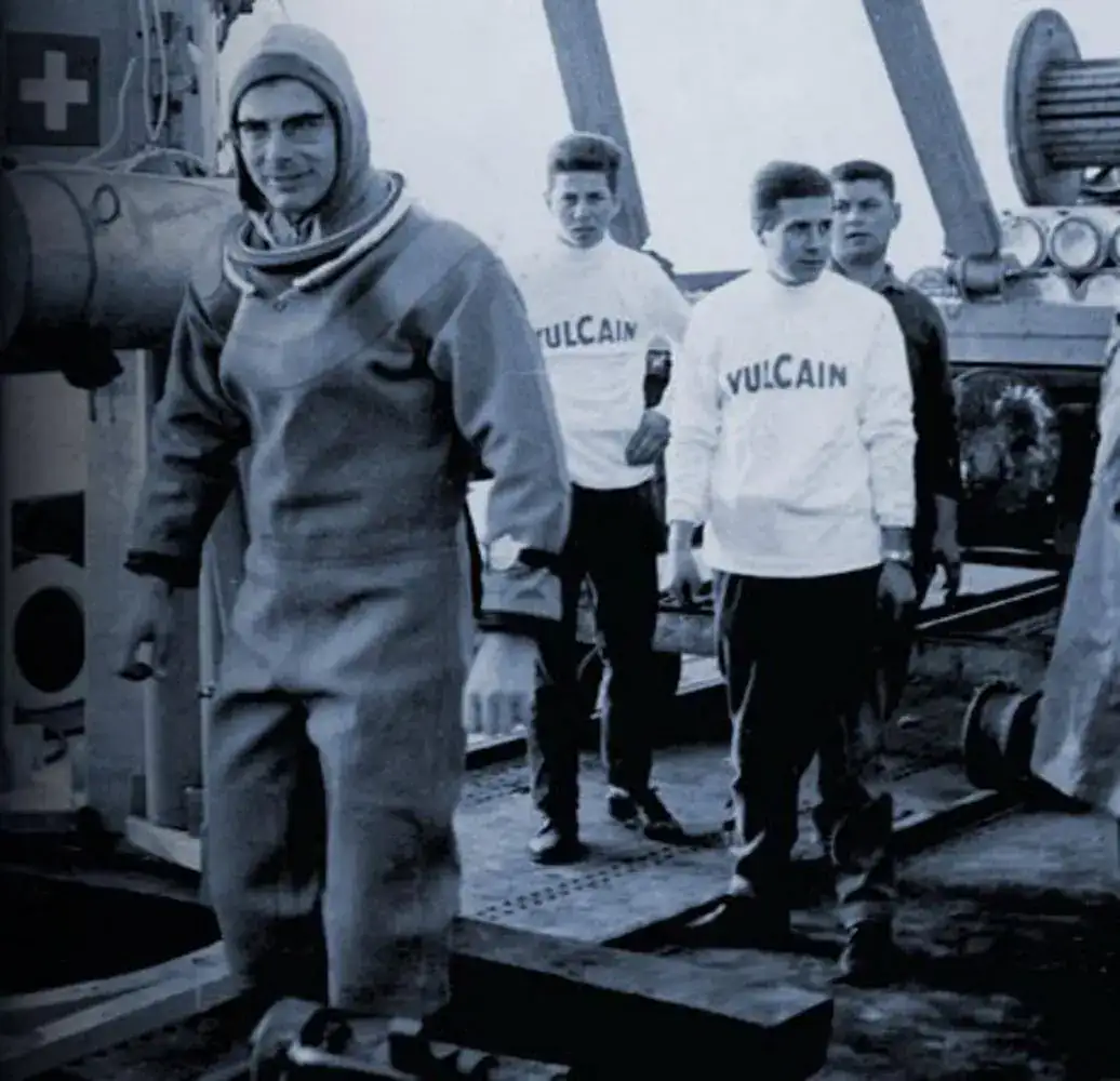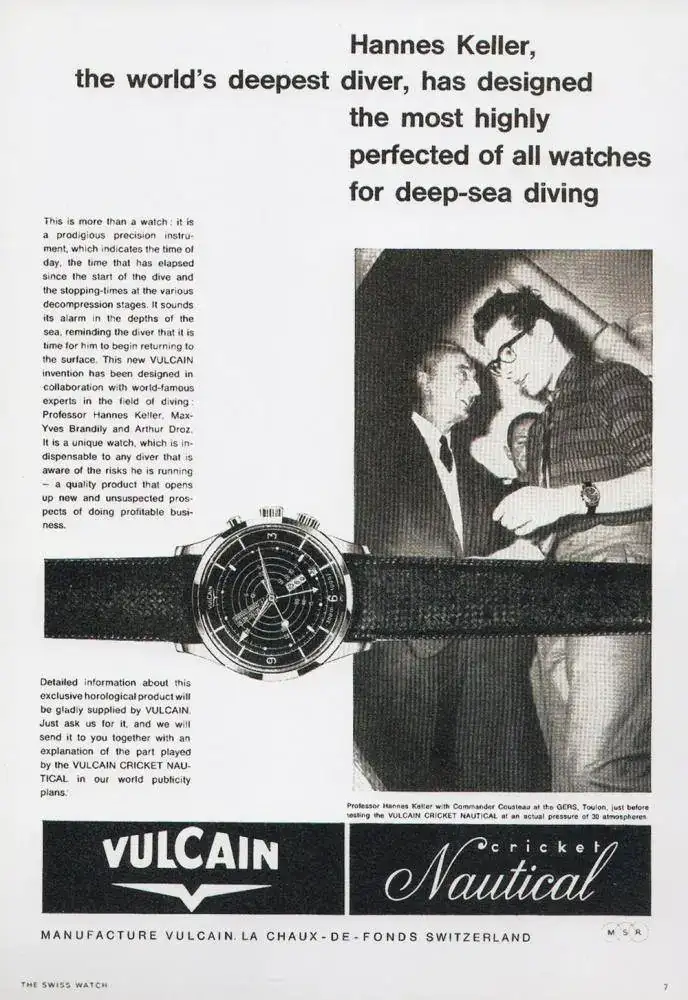 Poco después, en 1961, aparecerá otra pieza espectacular, Vulcain Cricket Nautical (Ref. S2321). Impresionante reloj con caja EPSA Super Compressor de 42mm con una resistencia también de 300m y que incorpora el avanzado calibre Vulcaín 120, con alarma para avisar al buzo de un intervalo de tiempo, y con dial giratorio con tabla de descompresión y una ventana donde se muestran los tiempos y paradas de descompresión. Toda una innovación que alcanzó fama de la mano de Hannes Keller, al batir en 1962 el Récord mundial de profundidad en inmersión al llegar a 333 m (1000 ft) luciendo un Vulcain en su muñeca; y que además fue la primera inmersión en usar una mezcla de gases con Helio. Lamentablemente en esta inmersión fallecieron dos personas, el buzo acompañante Peter Small y otros joven buzo de apoyo. Eso no se recogió en la publicidad que acompañó al evento...