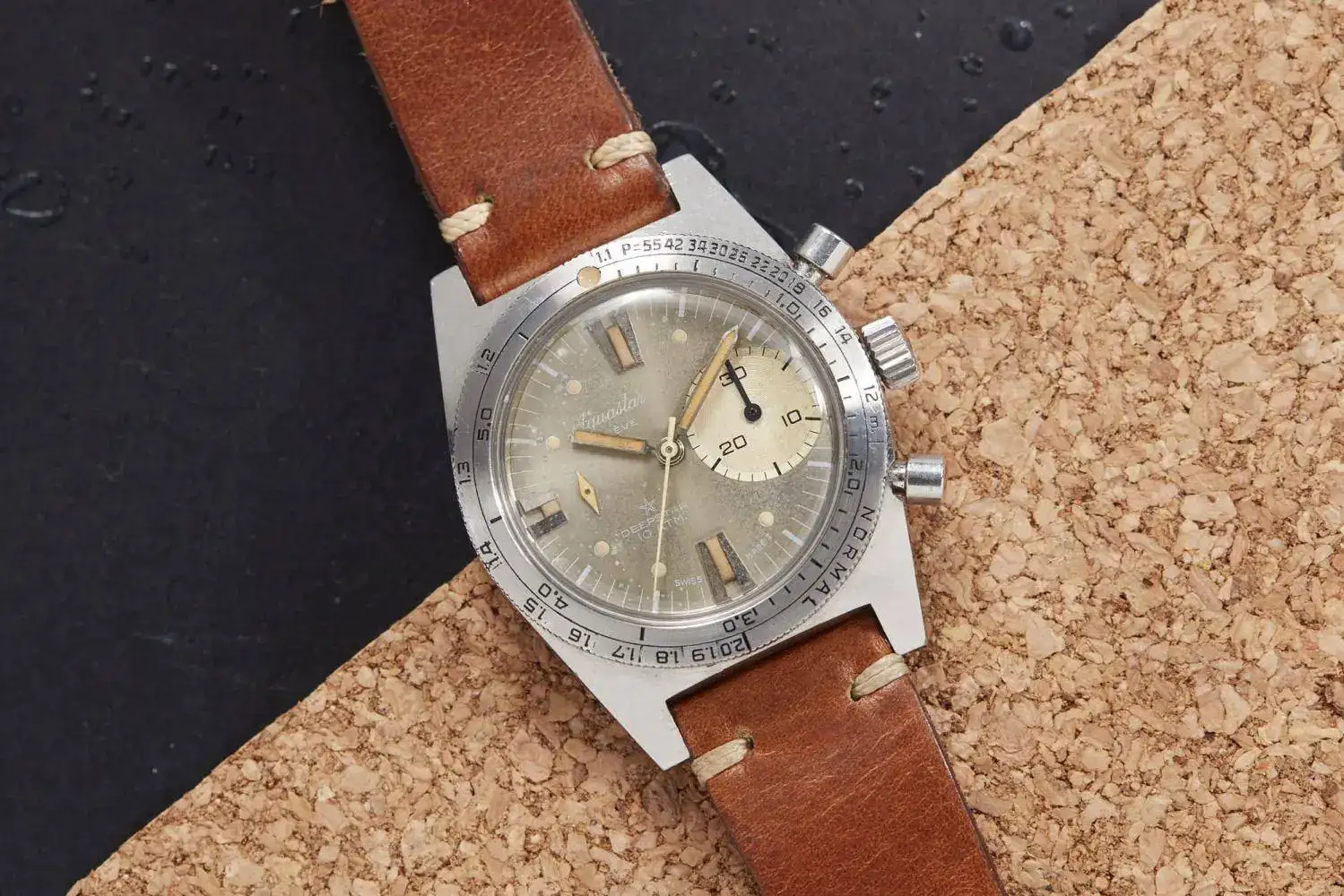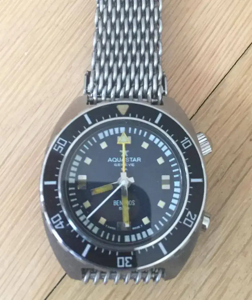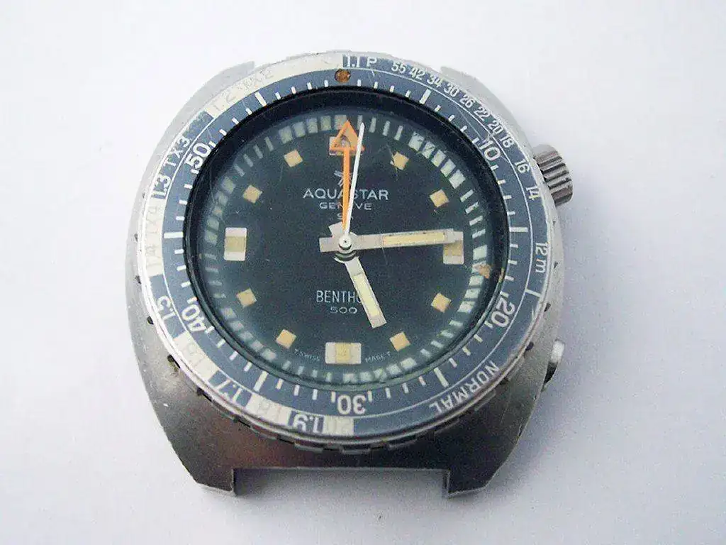 Después será otro modelo mítico dentro del mundo del buceo el que haga su aportación. Aquastar Deepstar de 1965, con un bisel que muestra los tiempos de difusión del nitrógeno, y que había de compararse con unas tablas que se entregaban junto al reloj. Este bisel fue patentado en 1964 (patente CH436140A). Esto unido a su fiable cronógrafo valjoux 23 explican porqué fue tan usado por el Equipo del Comandante Cousteau, y porque un ejemplar en buenas condiciones supera los 10.000€.