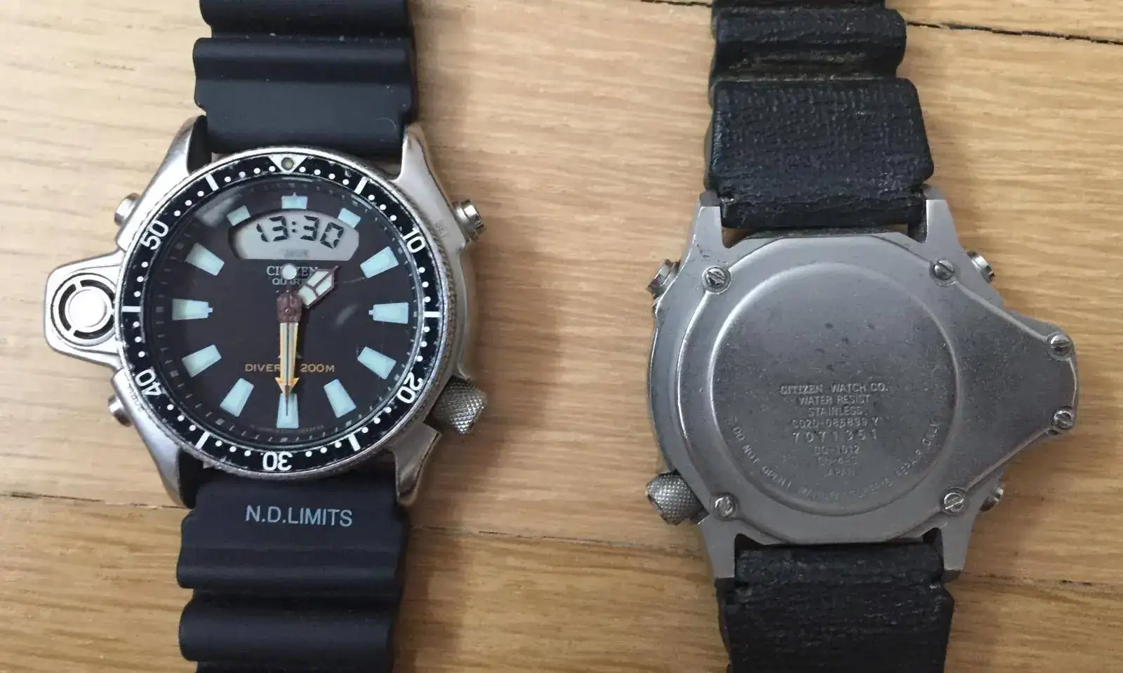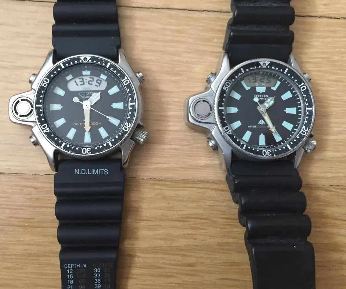 Este reloj supone la introducción de la electrónica al mundo de los relojes de buceo, incorporando profundímetro electrónico, crono, alarmas e incluso memoria de las últimas inmersiones. Muestro dos unidades de mi colección de la primera serie C020 de 1985 y segunda serie de 1990 de este antecesor del reloj-ordenador de buceo.