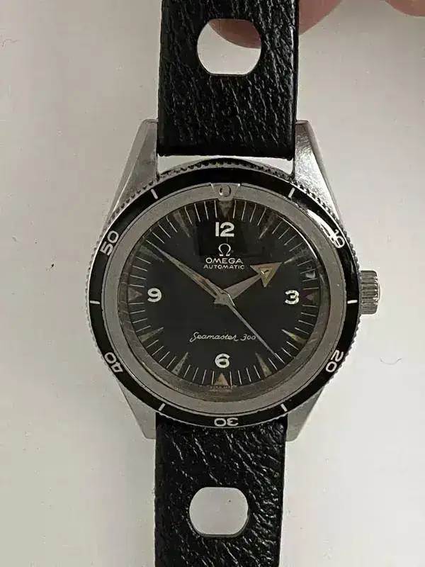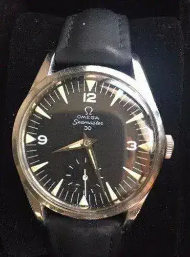Este calibre sirvió también para el modelo Omega Seamaster 30 (CK 2937) de 1962 de mi colección. Comparte no solo calibre sino también el característico dial de máxima luminosidad que deriva de los desarrollados también para la WWII, y que incluyen fondo negro, números arábigos grandes y agujas y marcas luminiscentes. Es importante destacar que la denominación 30 no hace referencia a la profundidad soportable, sino al diámetro en mm de su movimiento. La caja en este caso mide 35,5 mm y se acompaña tanto de su armis original como de correa de cuero original, para variar según el uso que se le fuera a dar.