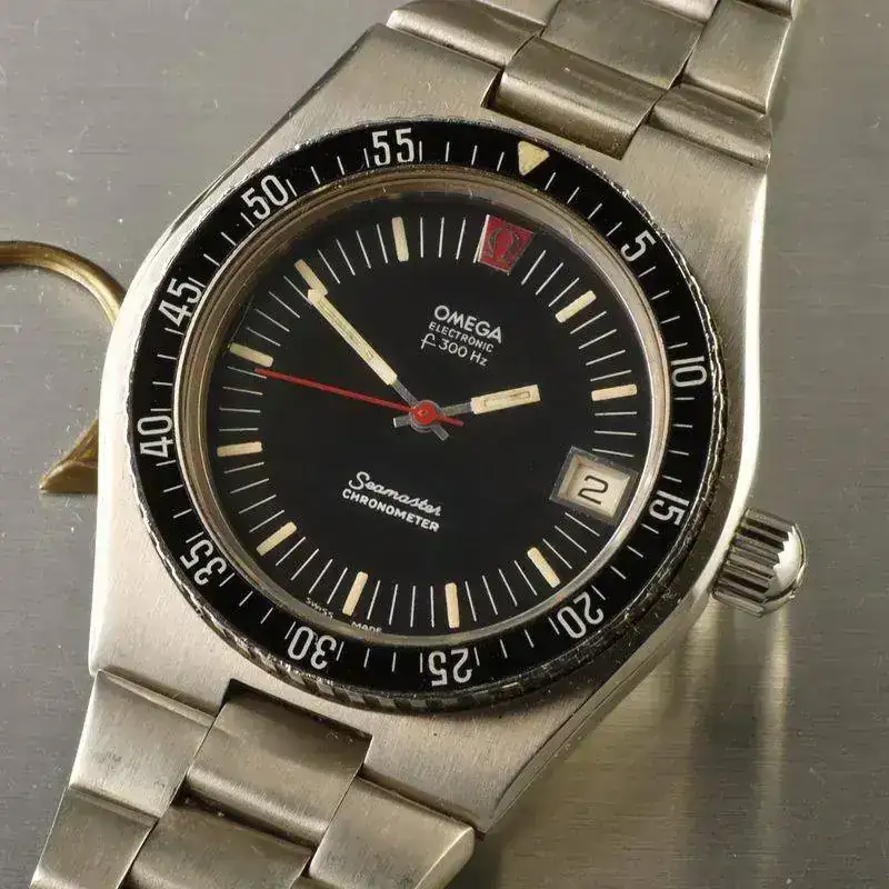 1971, Omega SM Electronic F300Hz, con calibre 1250 que es un ESA basado en los modelos Accutron de Bulova, es decir en la frecuencia de resonancia de un diapasón. En este caso 300 Hz, lo que dota al reloj de una elevada precisión respecto a calibres mecánicos anteriores.