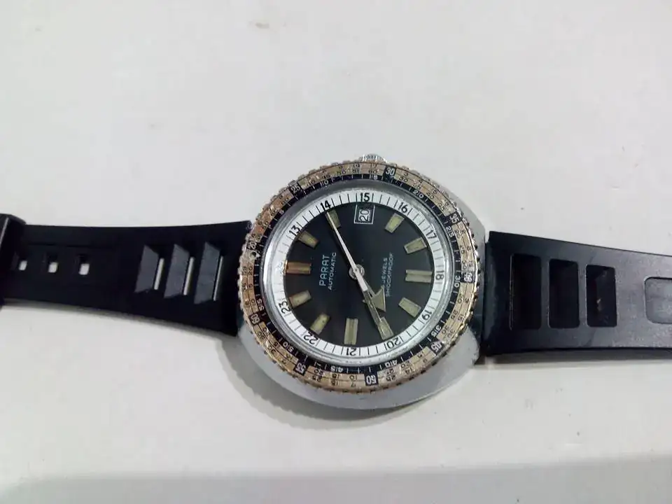 Hola foreros,ha llegado a mis manos esta maravilla muy poco conocida,les puedo contar que lleva un movimiento PUW 1561 E de 25 jewels,es alemán,y supongo que es de los 70,debido a su rareza me gustaría saber mucho mas sobre el,.....¿alguien tiene mas información?lo curioso es que el bisel ya es un no deco time como los de los doxa,........la caja mide unos generosos 45mm sin contar la corona que casi no sobresale,es muy parecida a las ufo,lleva marcador interno 24h y realmente me parece muy interesante.......Se trata de un PARAT AUTOMATIC SHOKPROOF