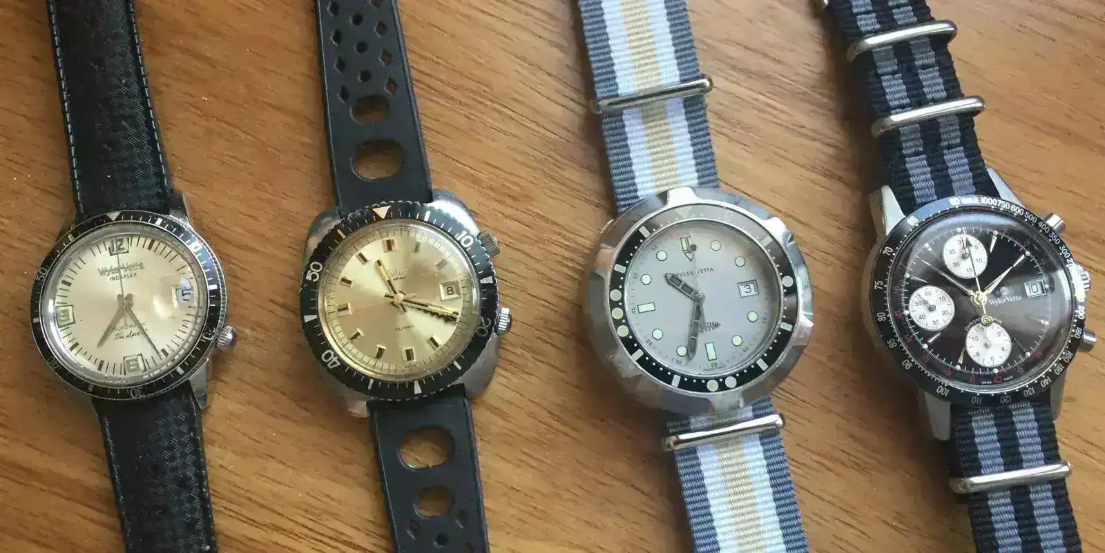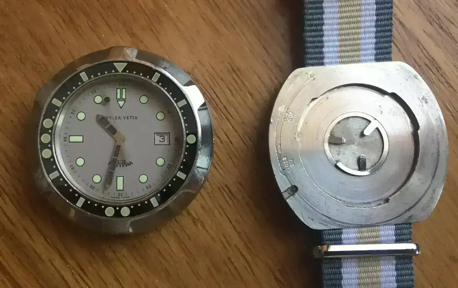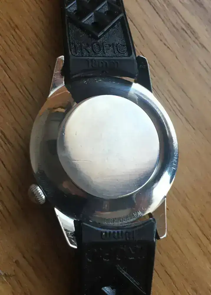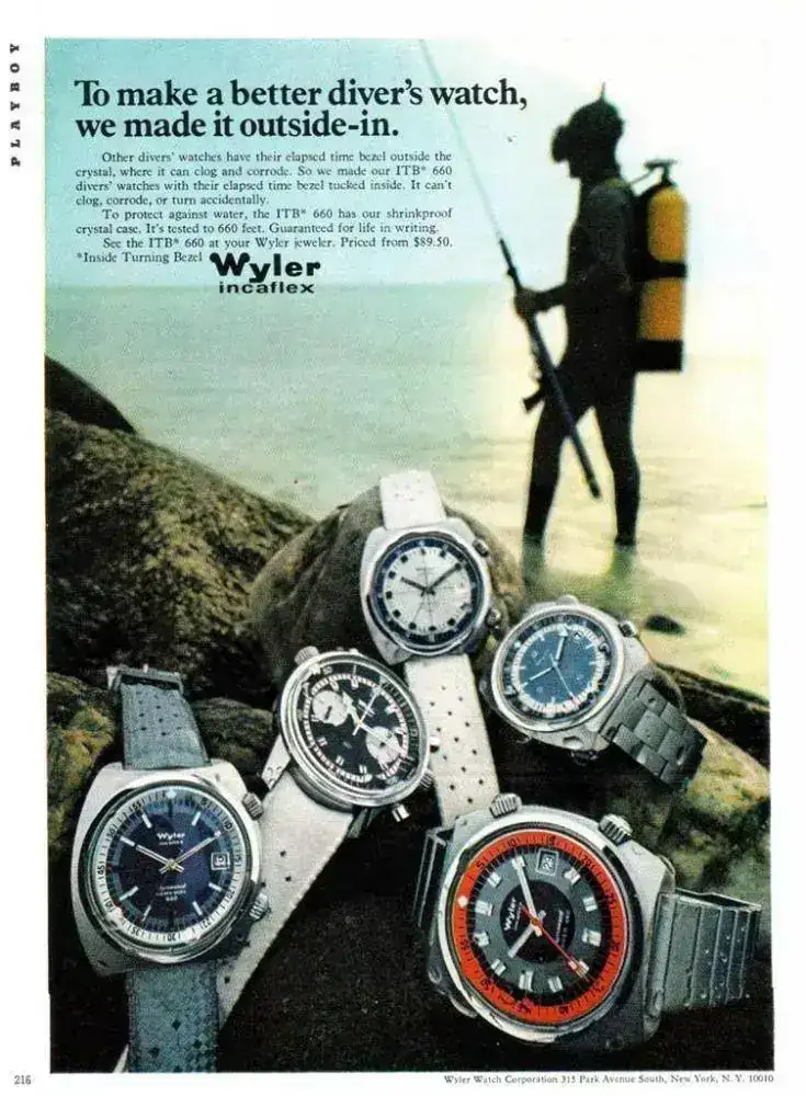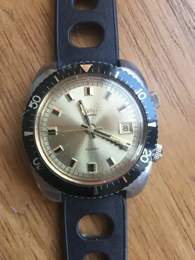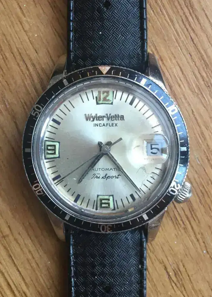 Wyler Tri Sport Automatic (Dynaflex Heavy Duty 660).Decada de 1960. Caja 3472/2-1162D (La "D" es de diver y supone cristal más grueso y caja sellada) es decir monobloque sellada, en este caso de 35,5 mm de diámetro. Calibre automático con base ETA, aunque otros modelos eran manuales . Mi unidad muestra una dial con arábigo 6,9 y 12; aunque hay diferentes modelos de diales. También hay versiones con marcación interna 24h y otros modelos sin ellas. Un reloj que quizás tenga un tamaño pequeño para los cánones estéticos actuales, pero eso no impide que ver las lineas de su caja, especialmente la trasera, sea un auténtico placer.