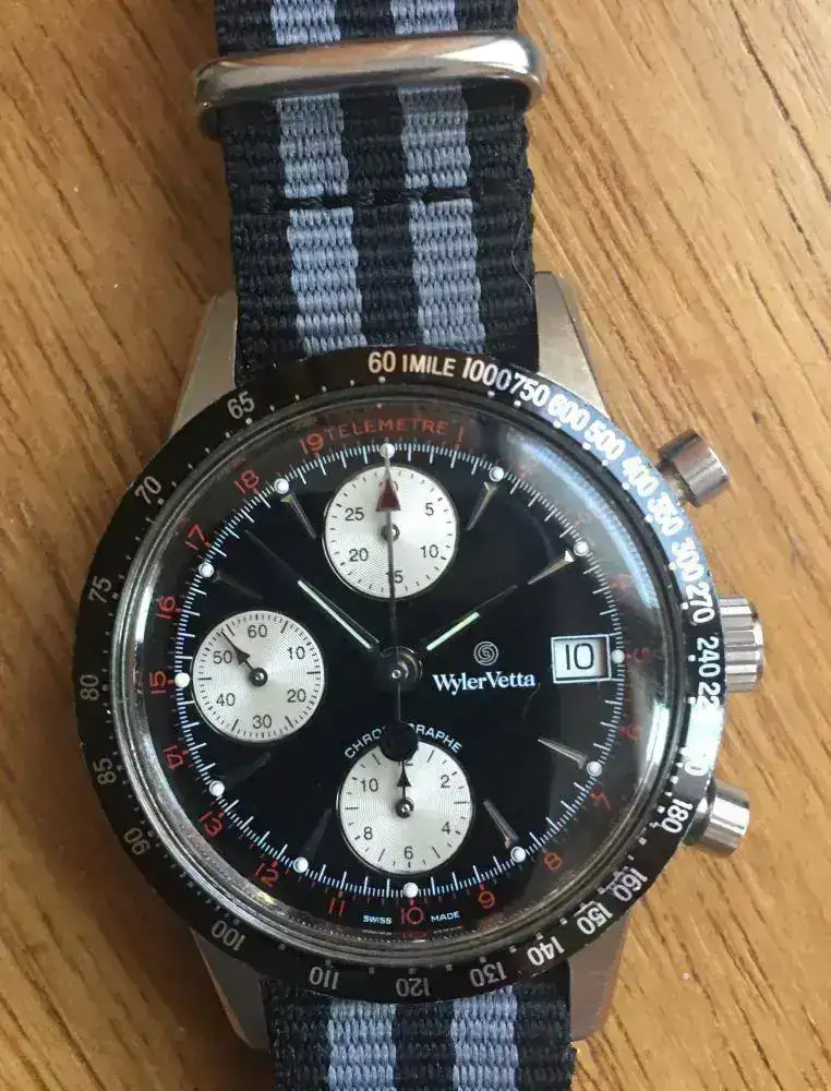 Wyler Vetta Chrono Automático 1990. Finalizo con una pieza que ya pertenece a los 90, por lo que debemos considerarla más Vetta que Wyler, es decir diseño italiano más que innovación técnica suiza. Este crono valjoux 7750 genérico y anodino para muchos, sin embargo gana muchos enteros al ir montado en una combinación espectacular caja/dial Wyler, con un diseñó “panda vertical” muy retro. Lo adquiri nuevo, y venía con su correa cocodrilo marrón correspondiente, pero dado que es poco acorde a mis gustos, le asigne una siempre socorrida NATO. El resultado lo tenéis a continuación. Pese a sus contenidos 39 mm de diámetro, en muñecas pequeñas como la mía lucen como el más pintado de los cromos vintage.