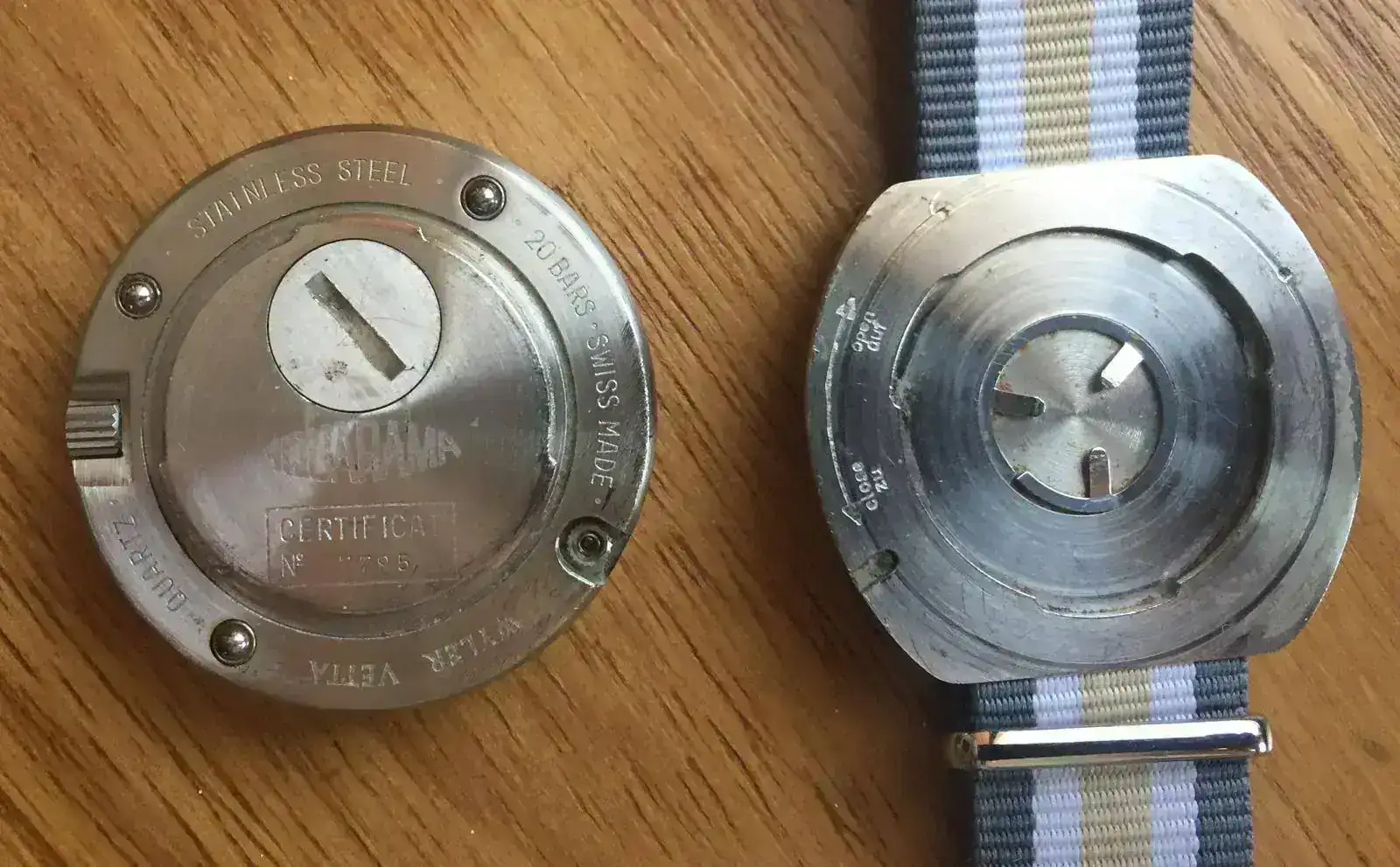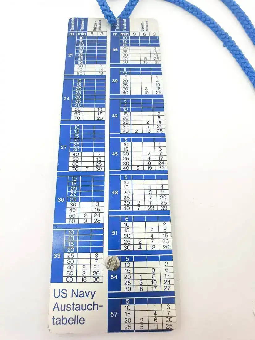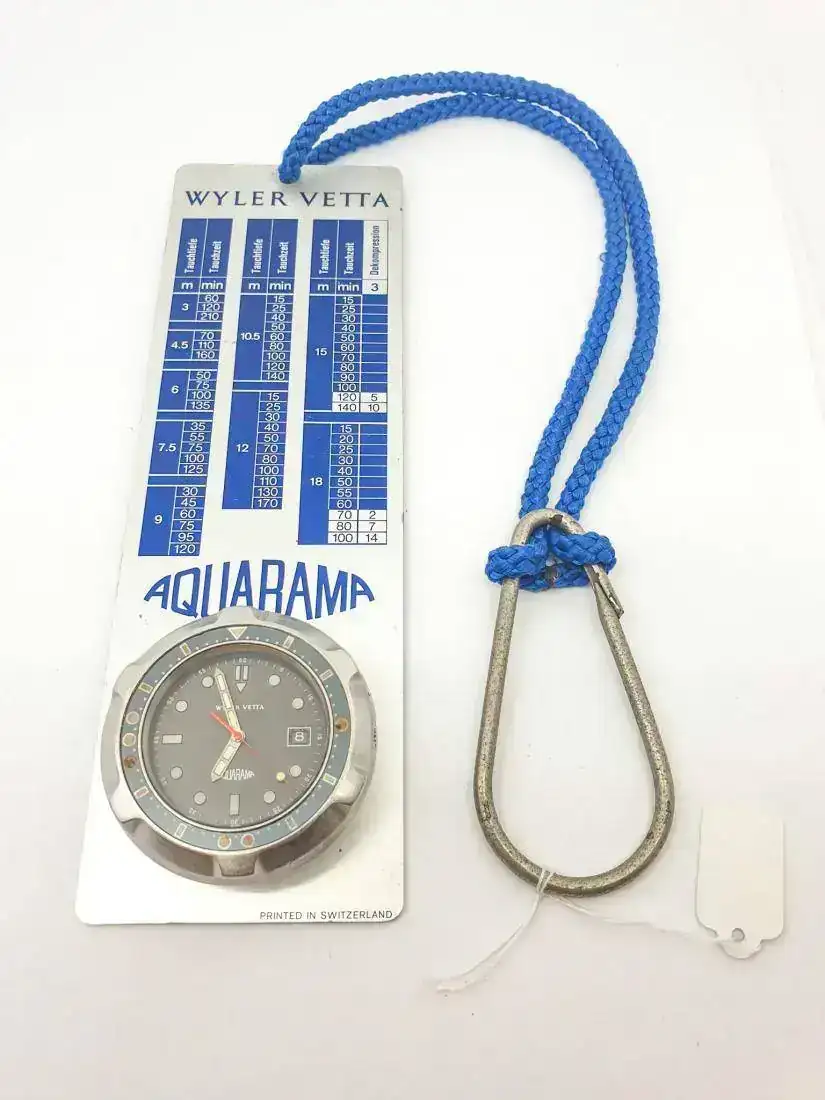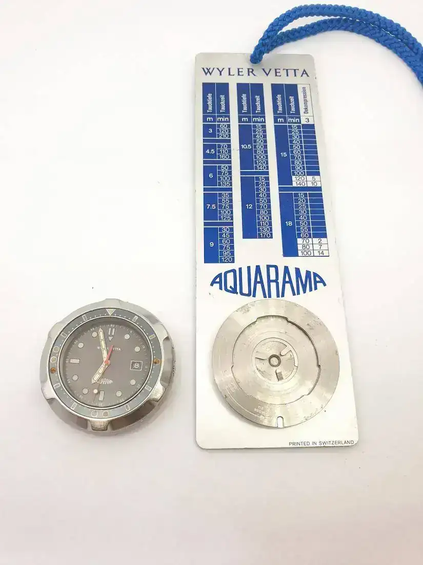 Wyler Vetta Aquarama Diver. 1970´s. 41mm. Uno de los diver que más aprecio de mi colección, por su diseño contundente y lo especial de su caja. La caja asienta en la muñeca sobre una placa de acero mediante un sistema de encaje-giro con rodamientos de bloqueo. Yo me he preguntado muchas veces el objeto de dicho diseño, pensaba que era para facilitar el cambio de batería, dado que en la parte posterior de la caja monobloque dispone de un compartimento para cambio de batería rápido con el empleo de una moneda; o bien para usarlo como cronómetro de mano en superficie; pero hasta hace poco no pude descubrir que estaba equivocado. Wyler había diseñado una pizarra metálica de buceo que puede ir colgada o enganchada, donde se encajaría el reloj y que dispone de una completa Tabla de Tiempos de Descompresión impresa; toda una herramienta de buceo "Professional". Es muy raro de encontrar una tabla de estas en el mercado. Aunque dispongo de su caucho original, dado que ha perdido toda su flexibilidad, le suelo acompañar de otro tipo de correas. Las fotos de la Tabla son de la red, pues sólo dispongo del reloj.