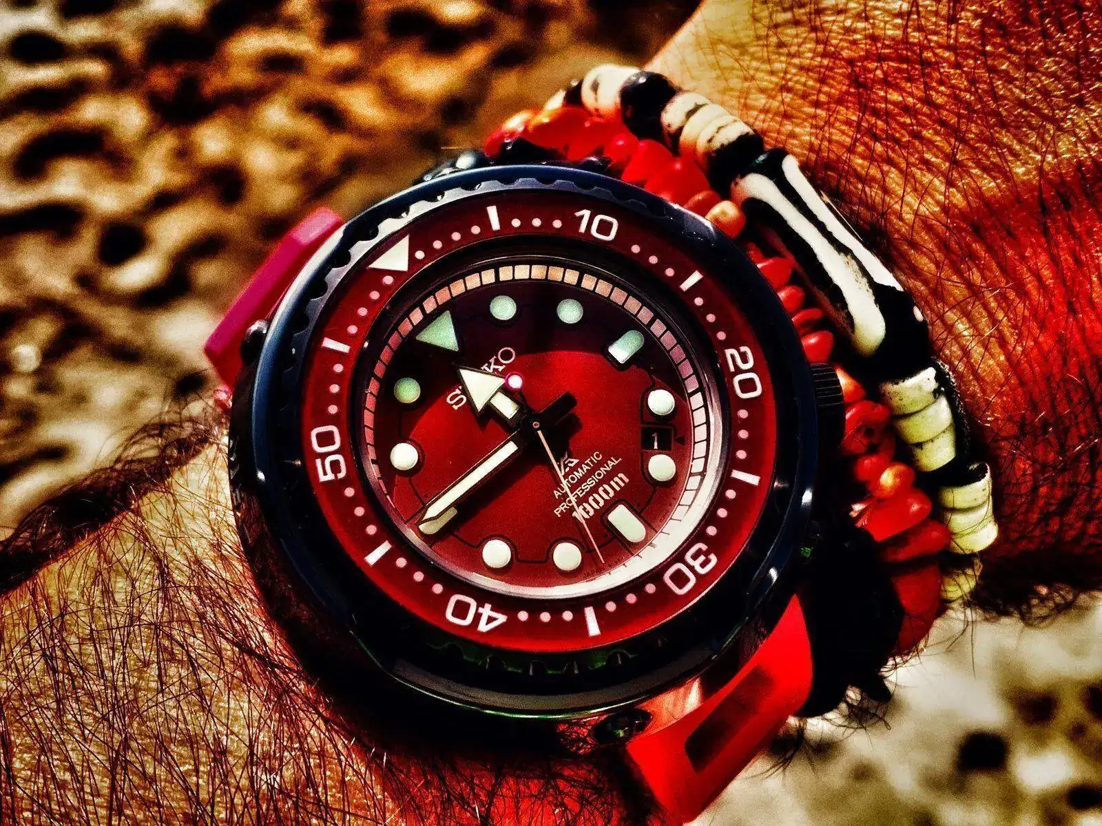 Jueves. Seiko Gundam edition. Un tuna de 1000mt. Burdeos muy potente y buena herramienta de buceo desde que salió un dibujo del prototipo me gusto muchísimo y aquí está dando guerra, le puse una obris Morgana roja y me gusta mucho