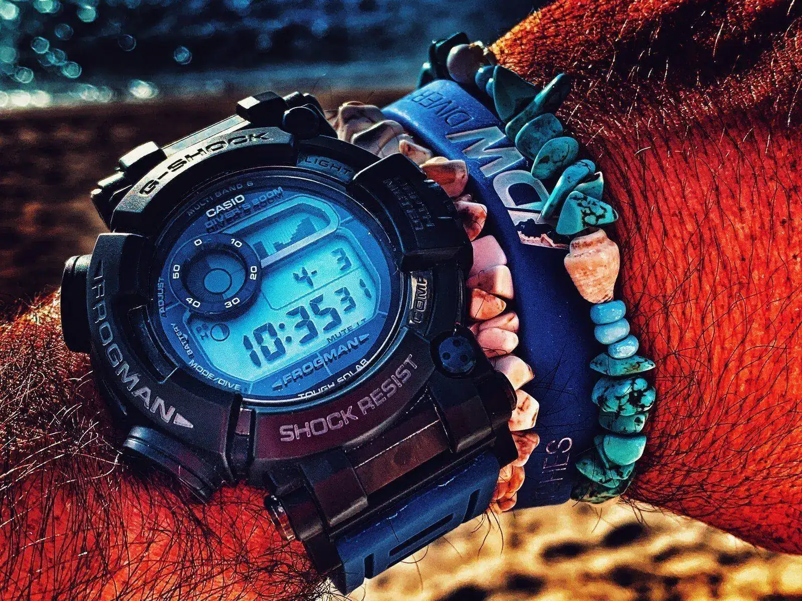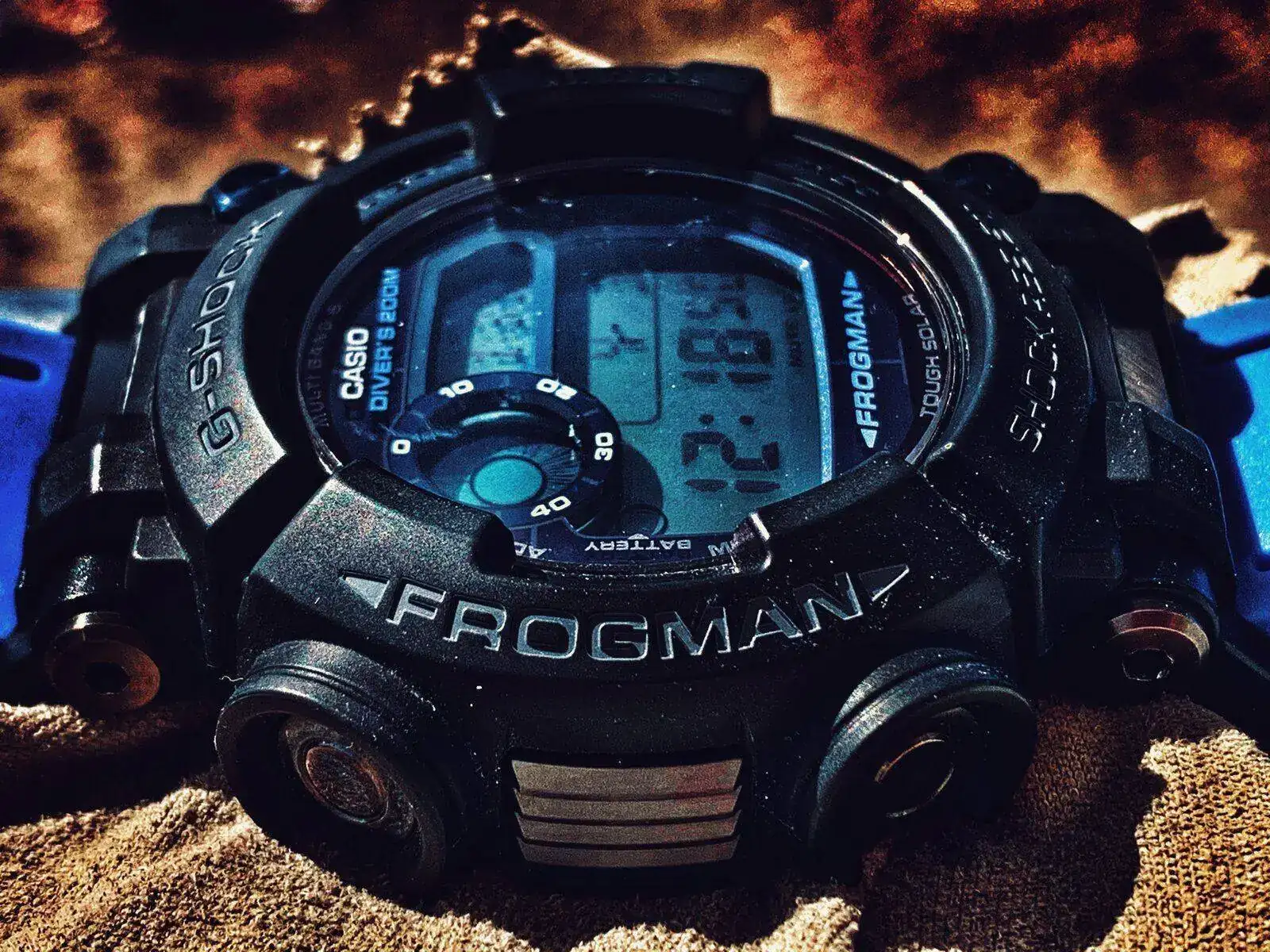 sabado frogman gwf d1000. U pedazo de G-Shock diseñado para los navy seal. Con todas las funciones de buceo y el crono sirve para la parada de descompresión. Se convirtió en mi reloj principal de buceo. Siempre llevo dos. Este es el fijo Le puse unos adaptadores de correas y bs con caucho azul haciendo juego con sus detalles. El zafiro se agradece mucho
