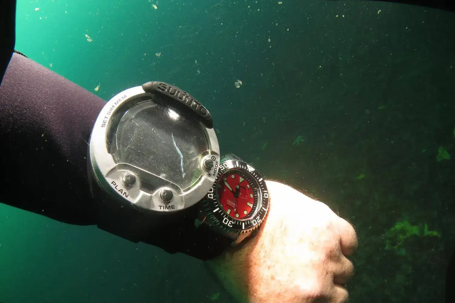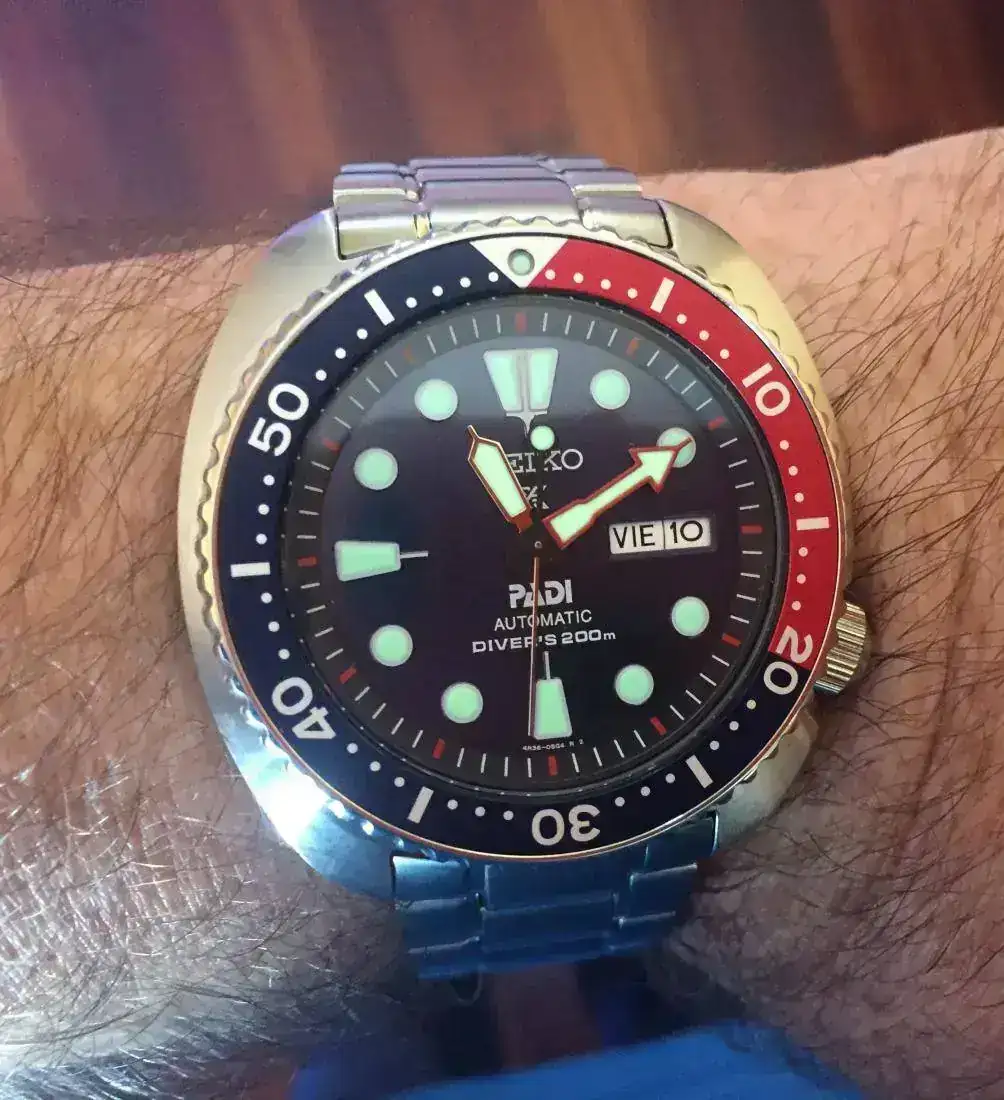 Orient Prosaturation: Pura herramienta contundente. Suelo bajarlo con el caucho, porque a veces los pasadores del armis se aflojan. Dudé en coger el negro, pero ahora encantado con el color. El lumen es el mejor de todo, en los buceos nocturnos es casi como llevar una linterna suplementaria.