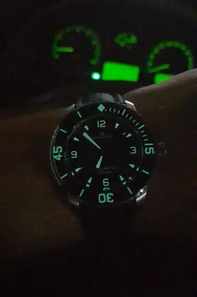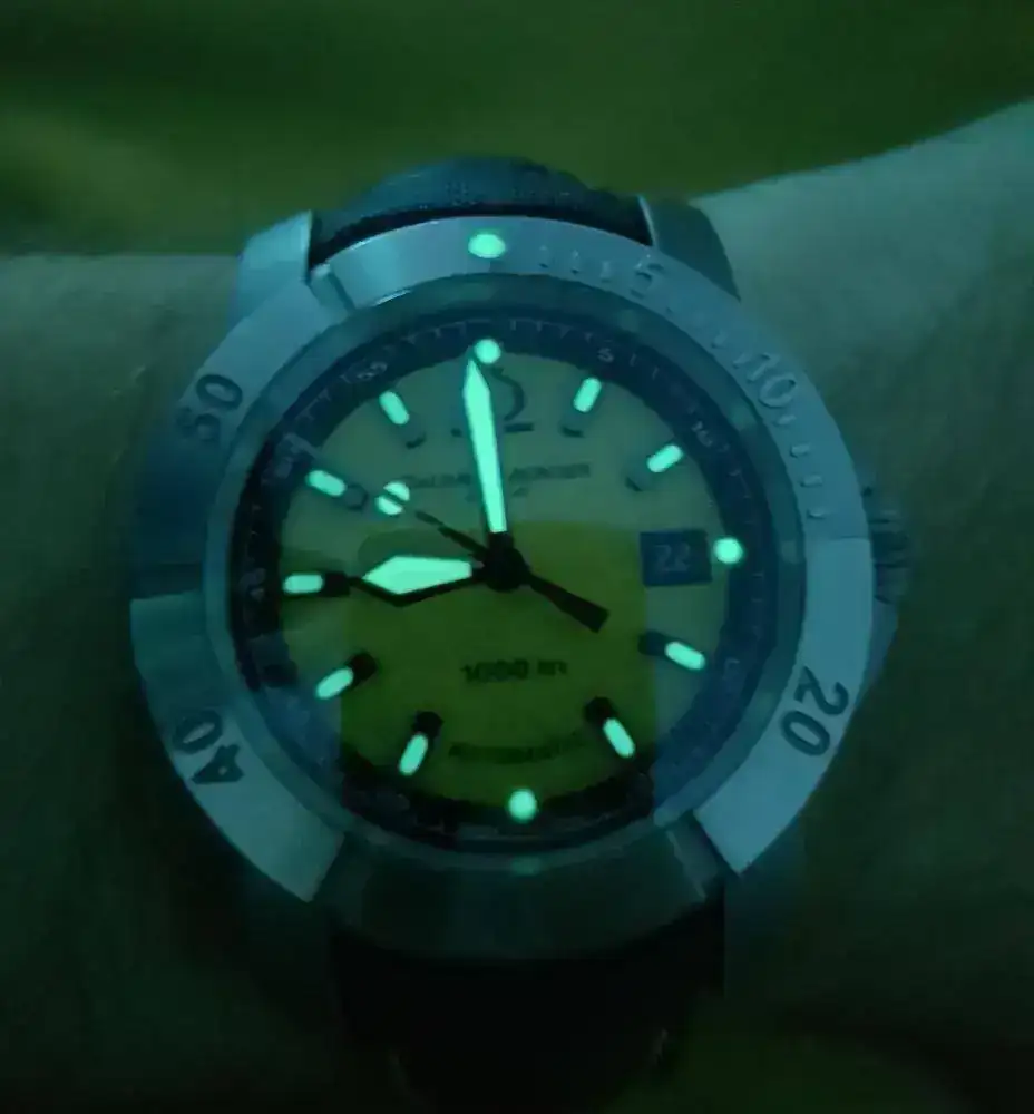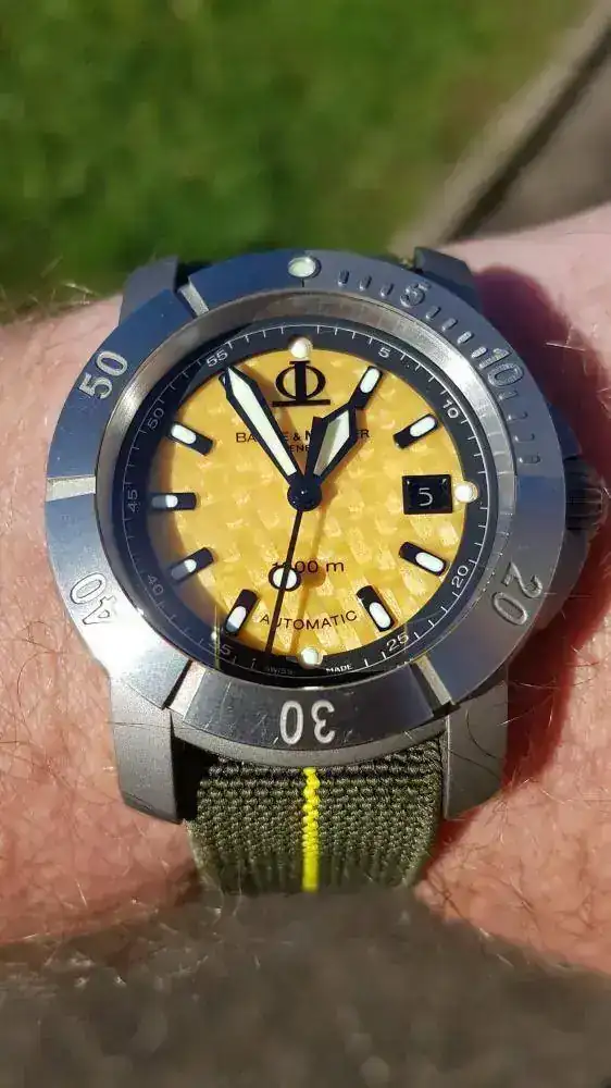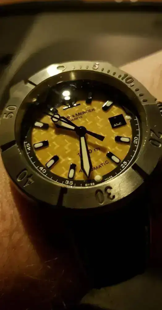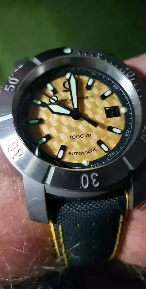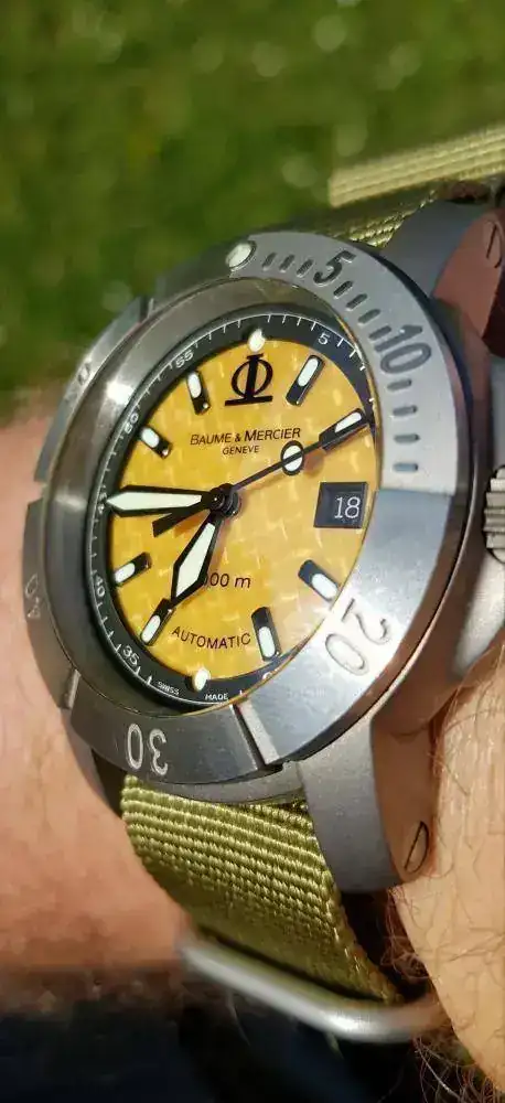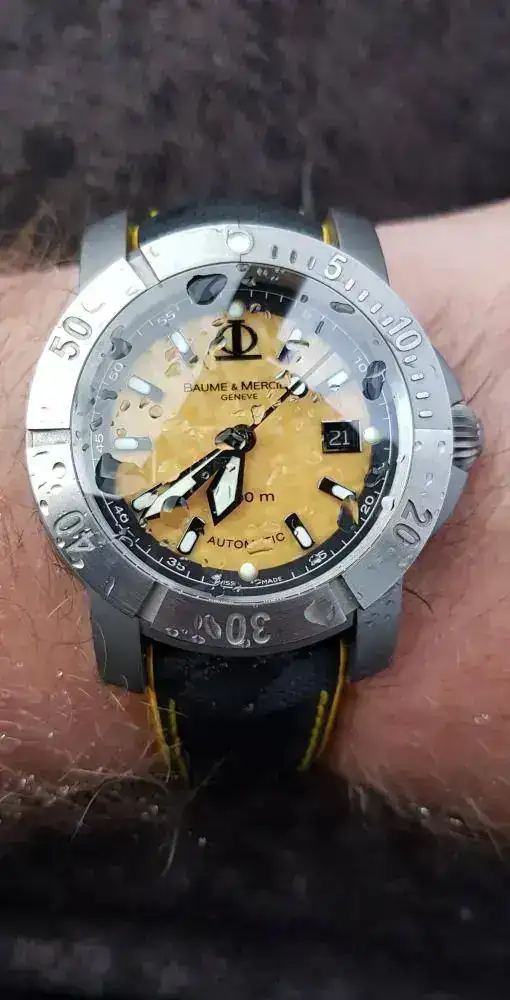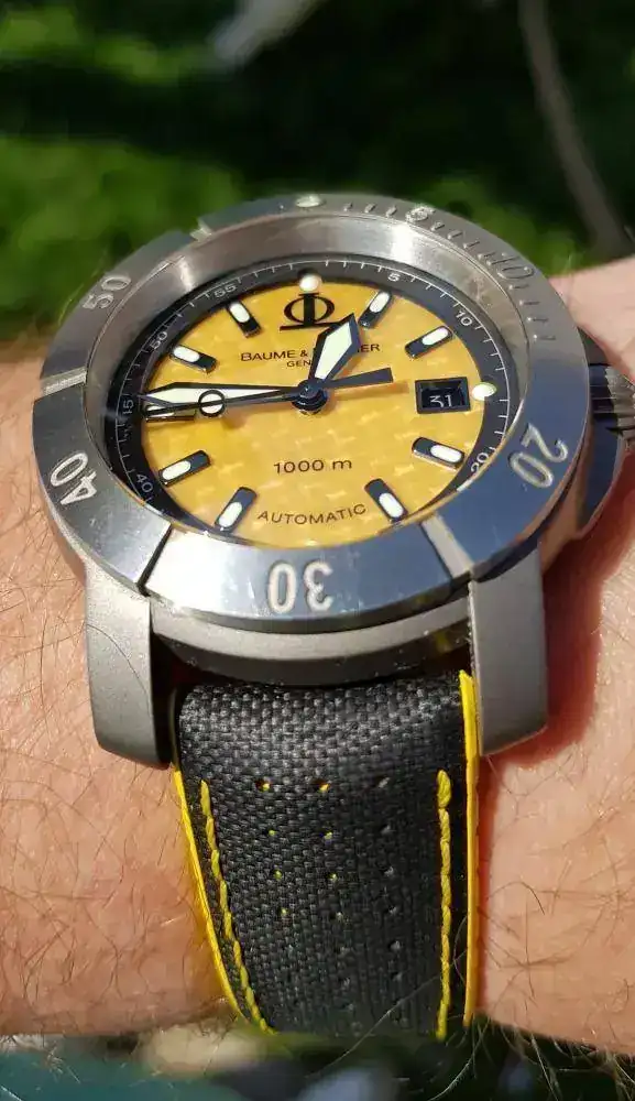 Para "competir" con el Tag, un Baume & Mercier que, aunque en este foro si está muy visto, no lo es, no solo por su rareza, sino por el fracaso que fue en su día. Le dio a B&M por arriesgar, salir de su zona de confort y hacer un diver extremo. No acertó ni una, y, con el tiempo, creo un icono de aficionados (sin posibilidad de brazalete, con dial amarillo, en titanio, y en 43mm...ni una). Como ese Tag, un incomprendido, pero fabricaron un relojazo adelantado a su tiempo, y hoy objeto de deseo...con un par de "güevos"