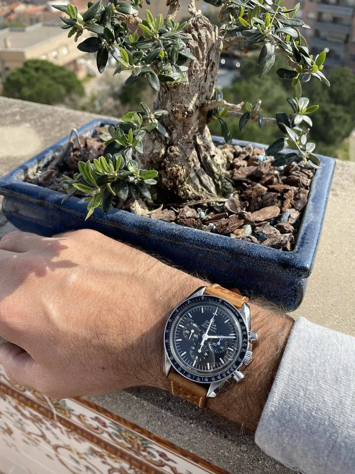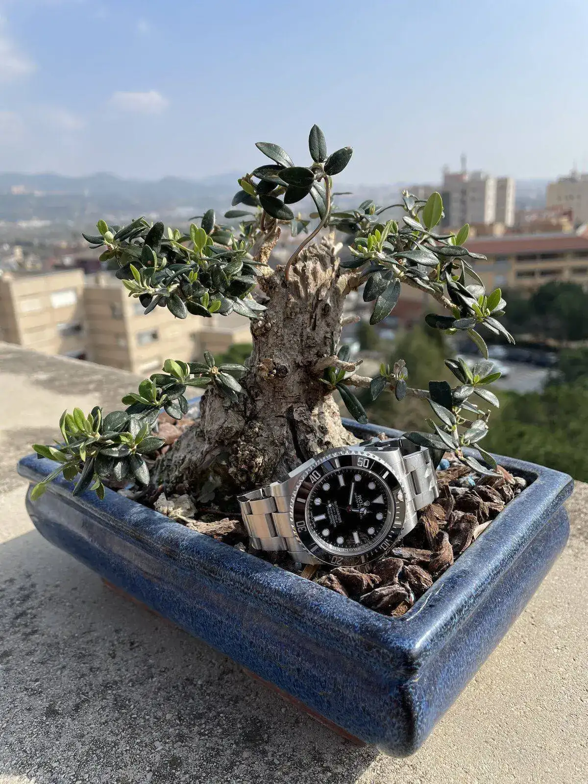 En una mañana soleada como la de hoy en Barcelona y aprovechando la entrada de un nuevo miembro a la colección, he decidido sacarles unas fotos con el teléfono móvil a los relojes junto a un bonito y muy mimado bonsái de olivo propiedad de mi padre.