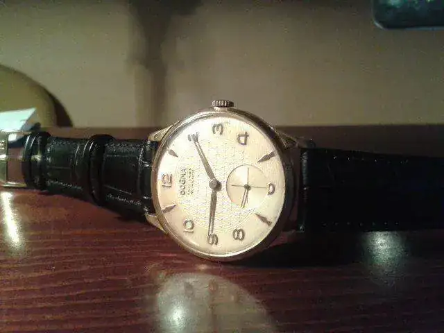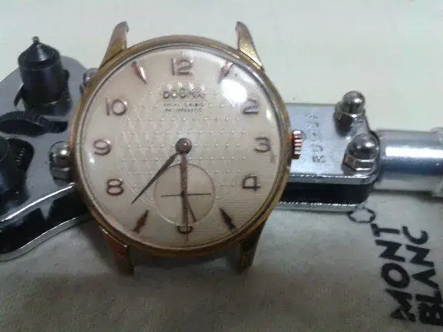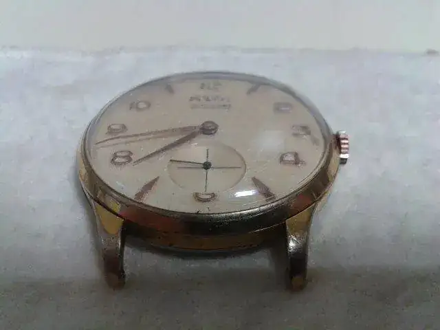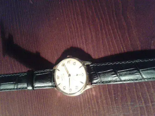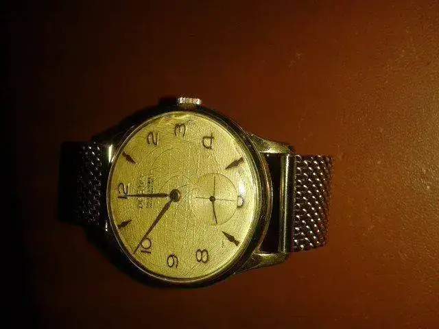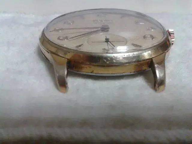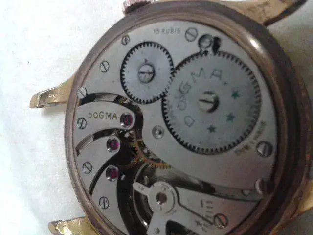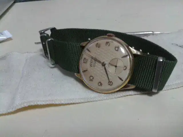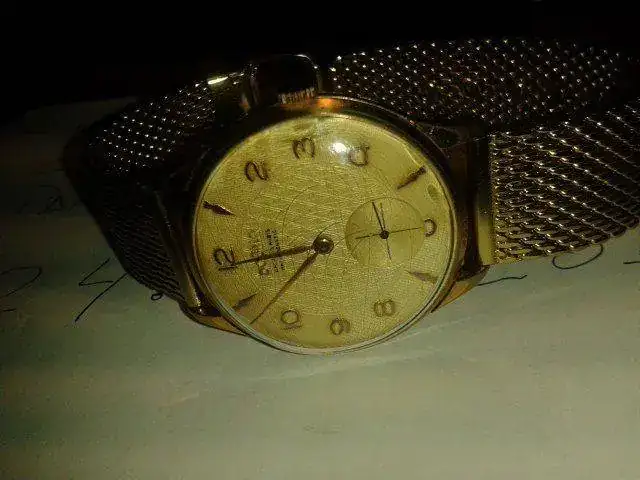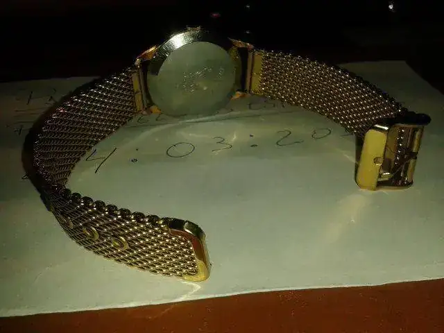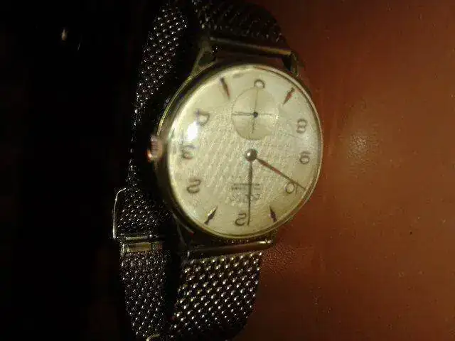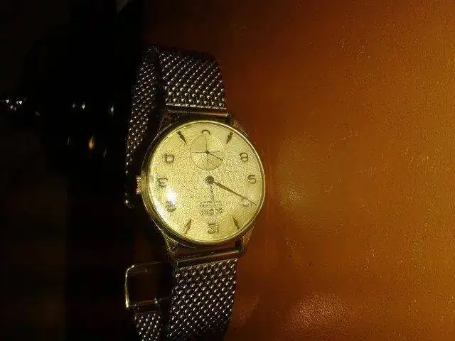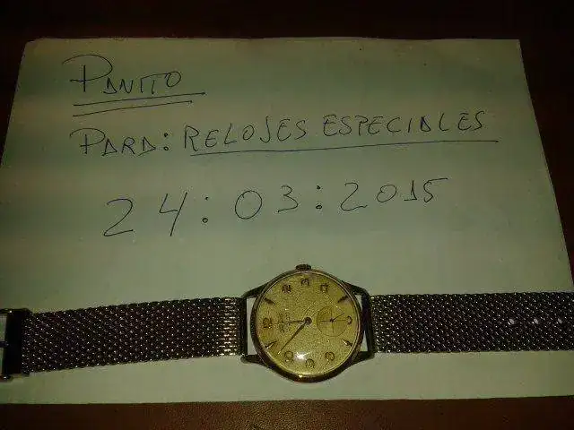 DOGMA VINTAGE años 50 finales principios de los 60 . calibre ETA 853 , CON UNA PRECIOSA PATINA Dorada , y dial texturizado , números arábigos intercalados con índices en dorado . se acompaña con milanesa dorada de alta calidad a juego . Tiene las marcas propias de un abuelete , y una pequeña marca en el plexi en la zona de las 3 , que hace parecer una leve sombra - si se mira fijamente se aprecia - he intentado sacarlo en las fotos . lo compre por 150 sin correa , y lo vendo por lo mismo con su milanesa a juego difícil de encontrar porque la distancia entre asas es de 21mm.