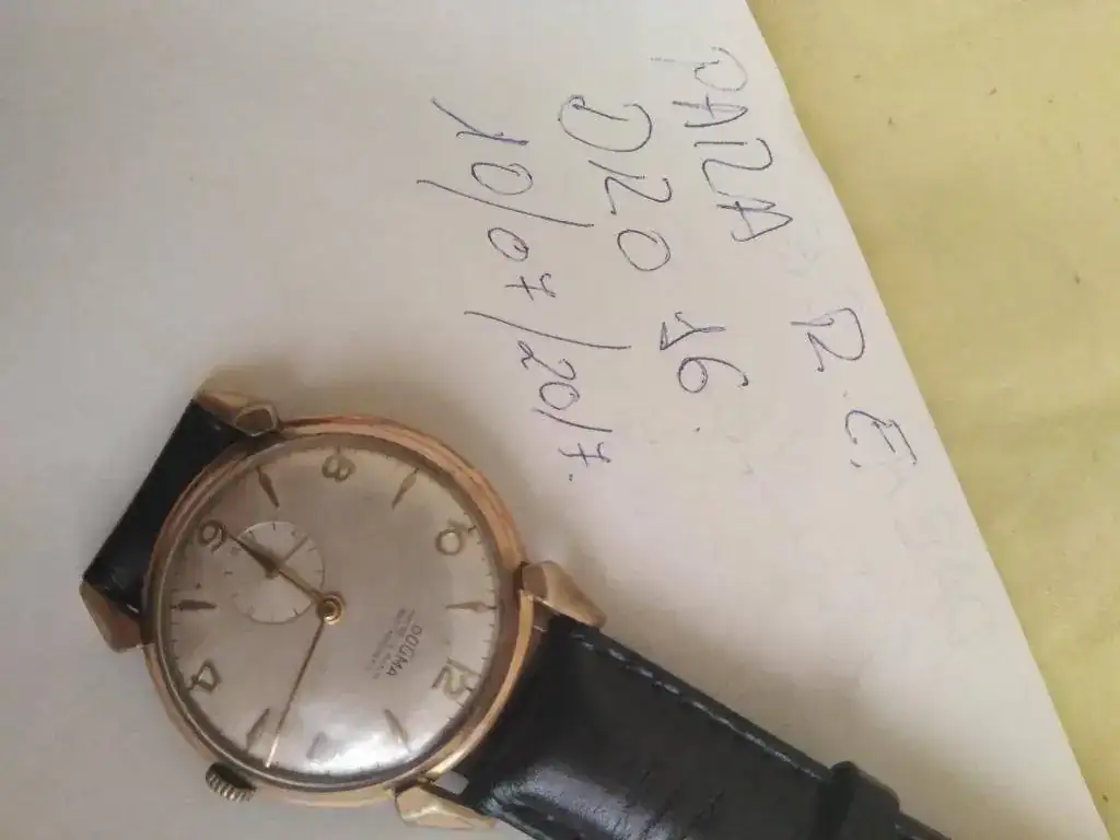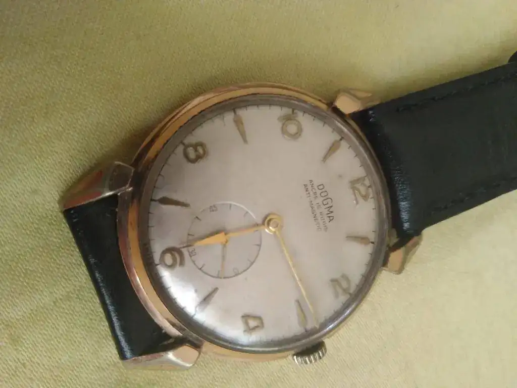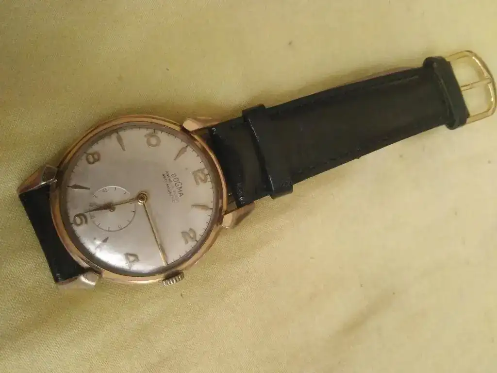 Ofrezco reloj Dogma con curiosas saetas y maquinaria ETA 900 en buen funcionamiento. Está firmada en la rueda de rochet. El dorado de la caja tiene zonas desgastadas. Las patas de soporte de la correa son muy originales: