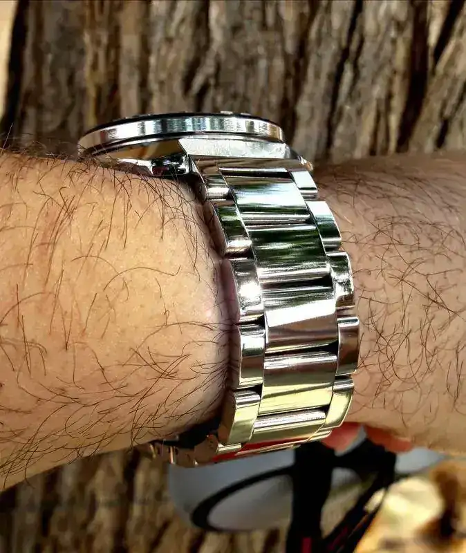Gracias! Mide 45 de bisel, que sobresale de la caja, y 52 lug to lug. Son medidas que sobrepasan el límite que tengo marcado para mi muñeca, sin embargo, al tener las asas muy inclinadas, me va perfecto y resulta muy cómodo.